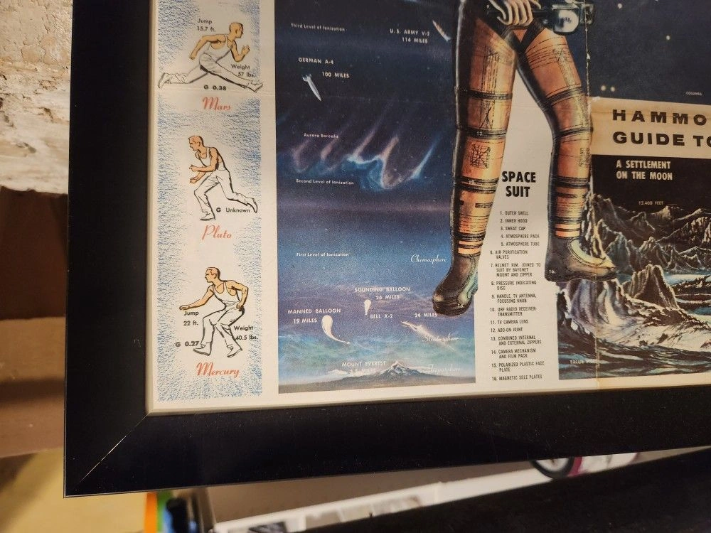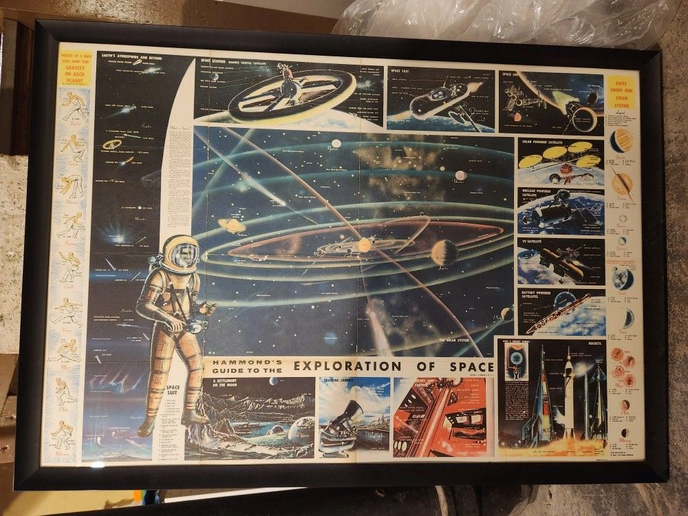 Hammond's Guide to Space Exploration circa 1960. Professionally framed with a black metal frame and glass to protect the art. 41" wide x 29" tall x 1" depth. Features: Framed Size: Large (up to 60 in) Medium: Lithograph