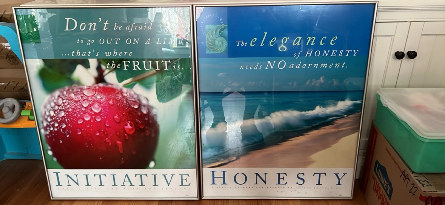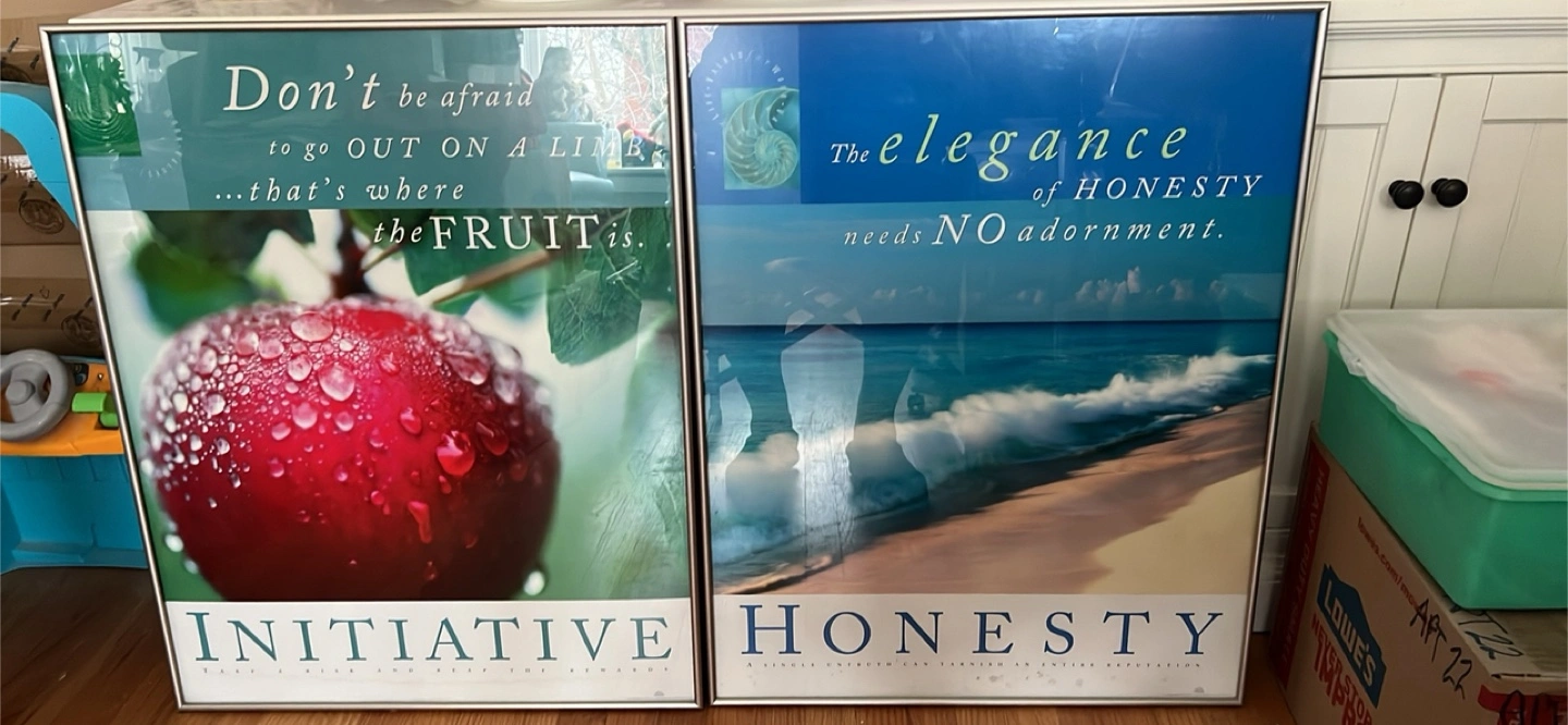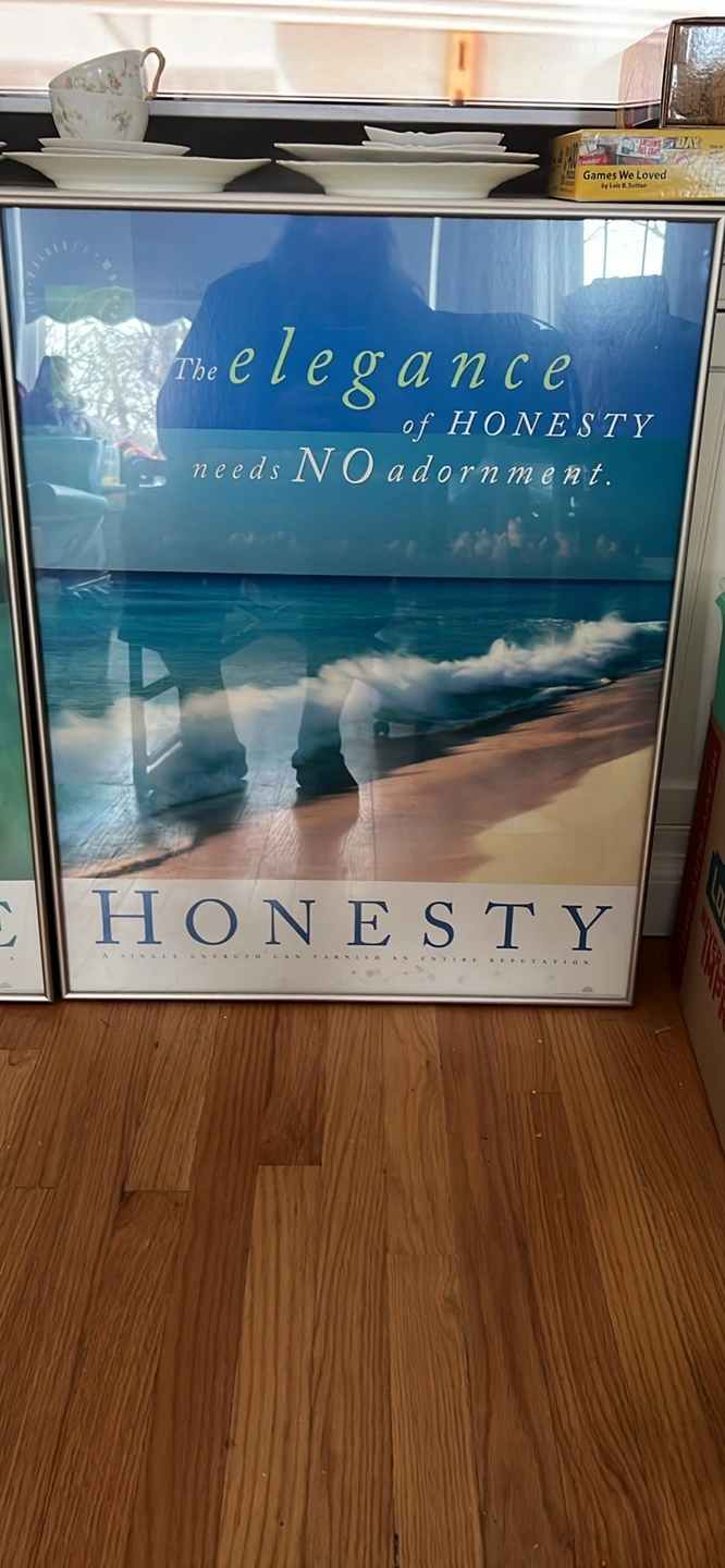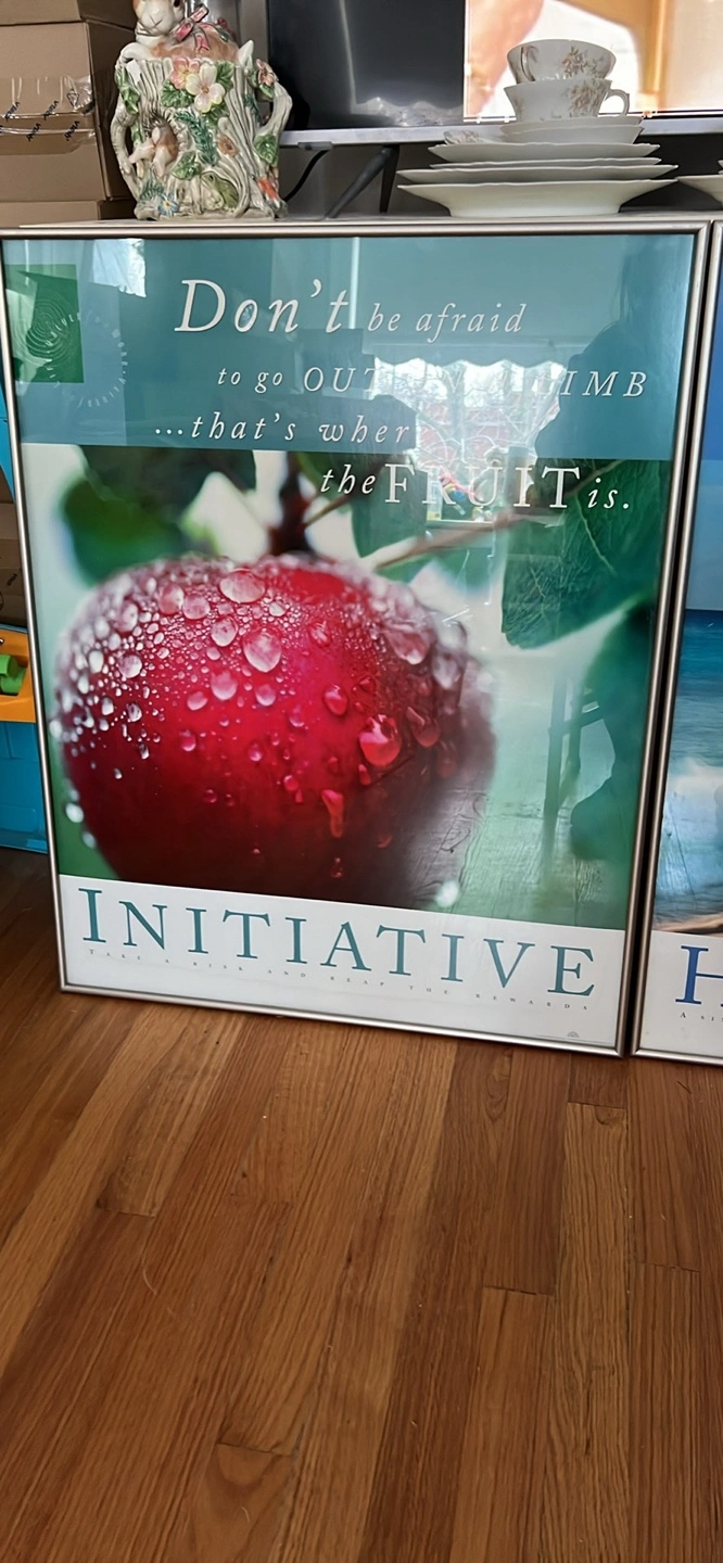 Last chance!!!Two framed prints for sale! One says 'Honesty' with the quote 'The elegance of honesty needs NO adornment'. The other says 'Initiative' with an image of a red apple and the quote 'Don't be afraid to go out on a limb... that's where the FRUIT is'. They are a great way to add some inspiration to your space