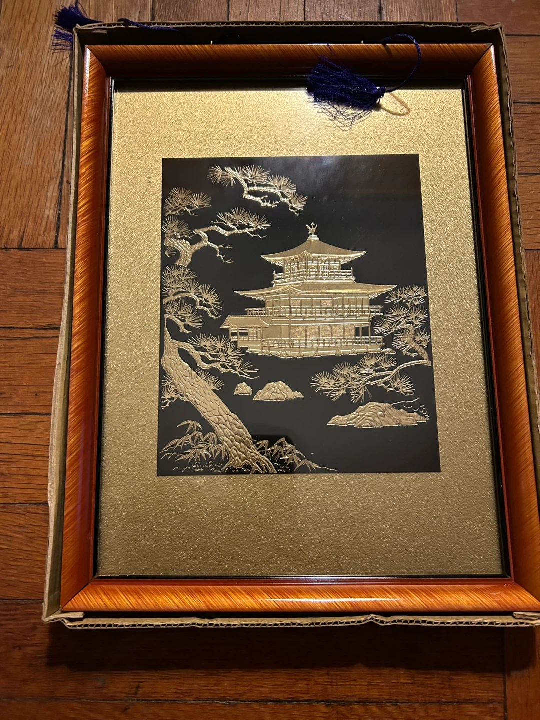 Beautiful framed art featuring a Japanese golden temple with intricate details. The frame has a nice wood grain finish and the artwork is in excellent condition. Comes with its original box