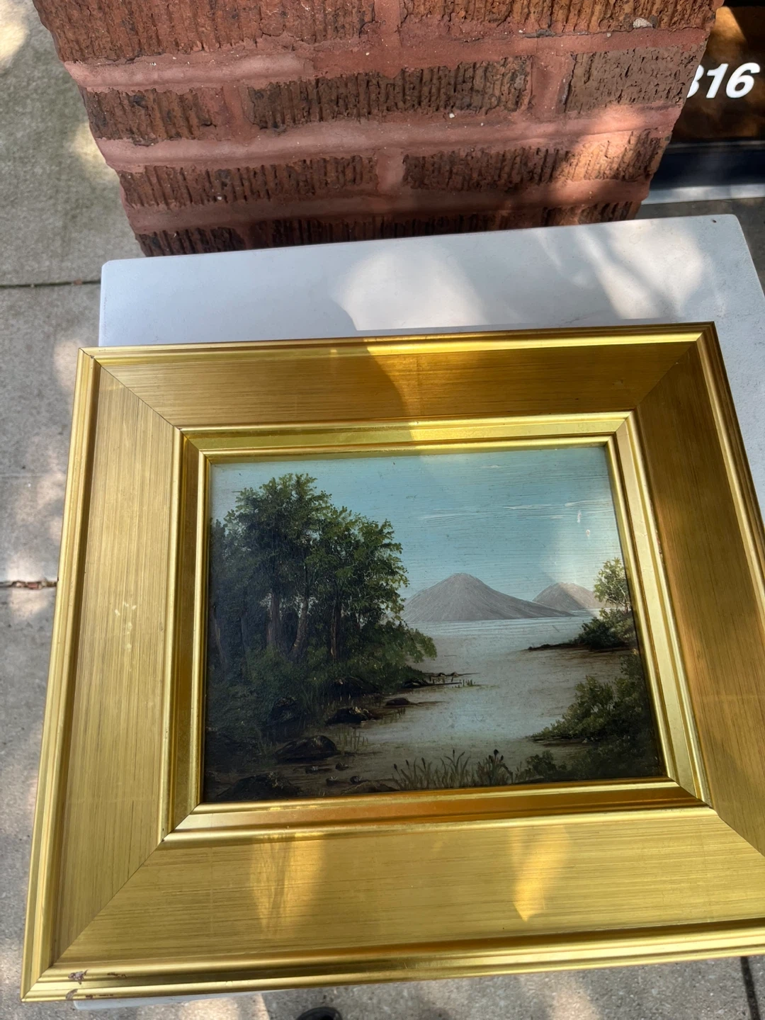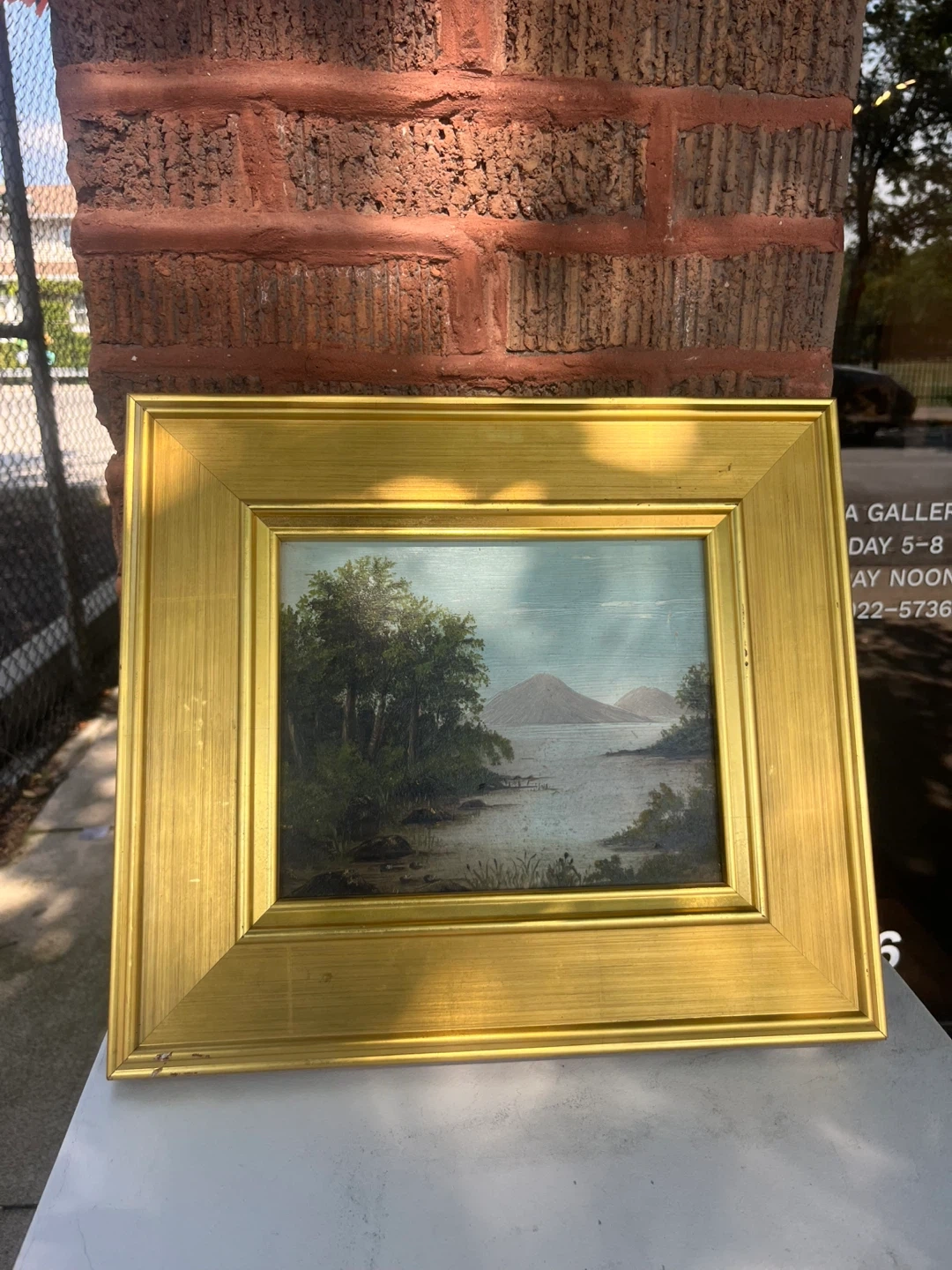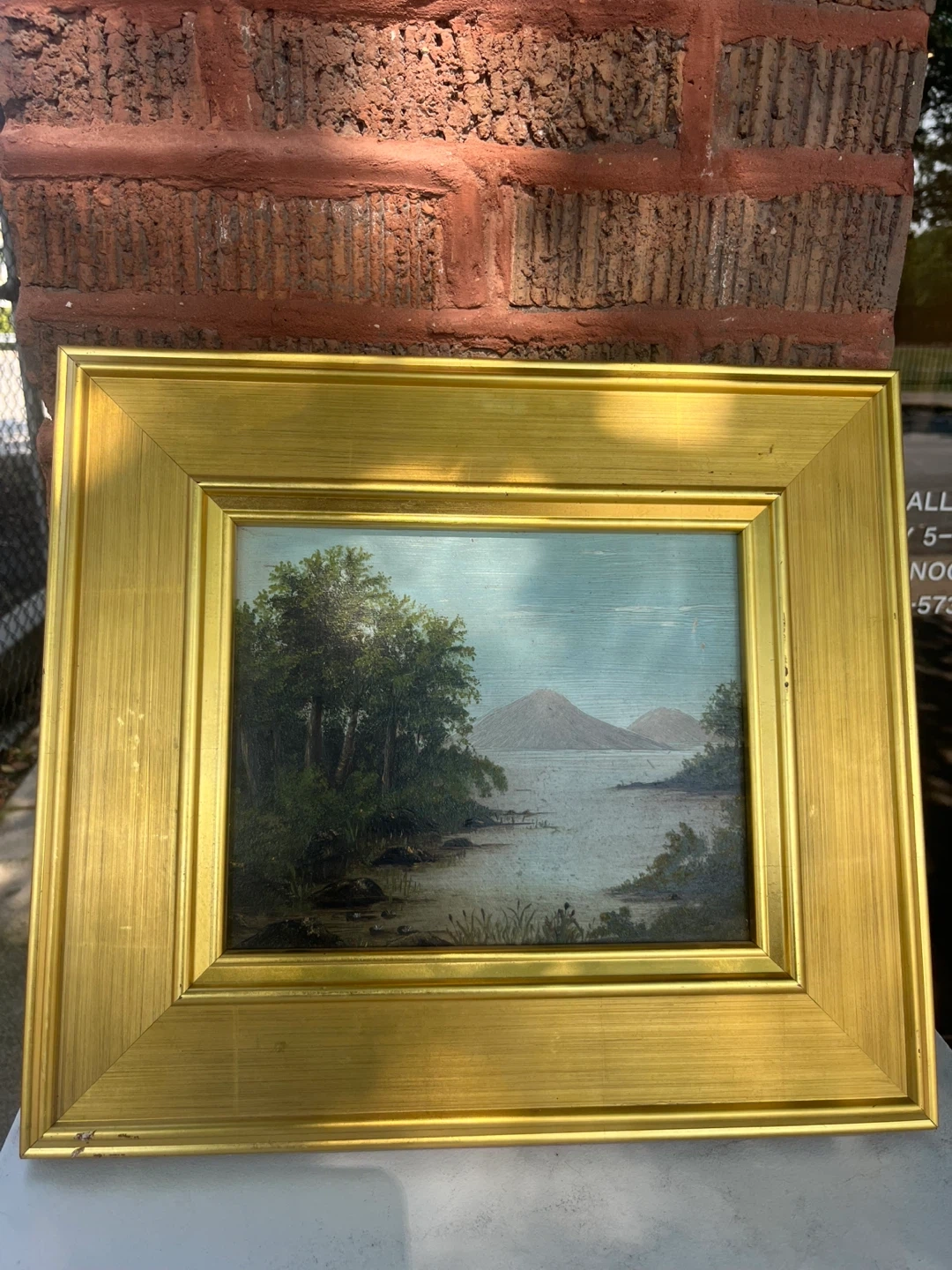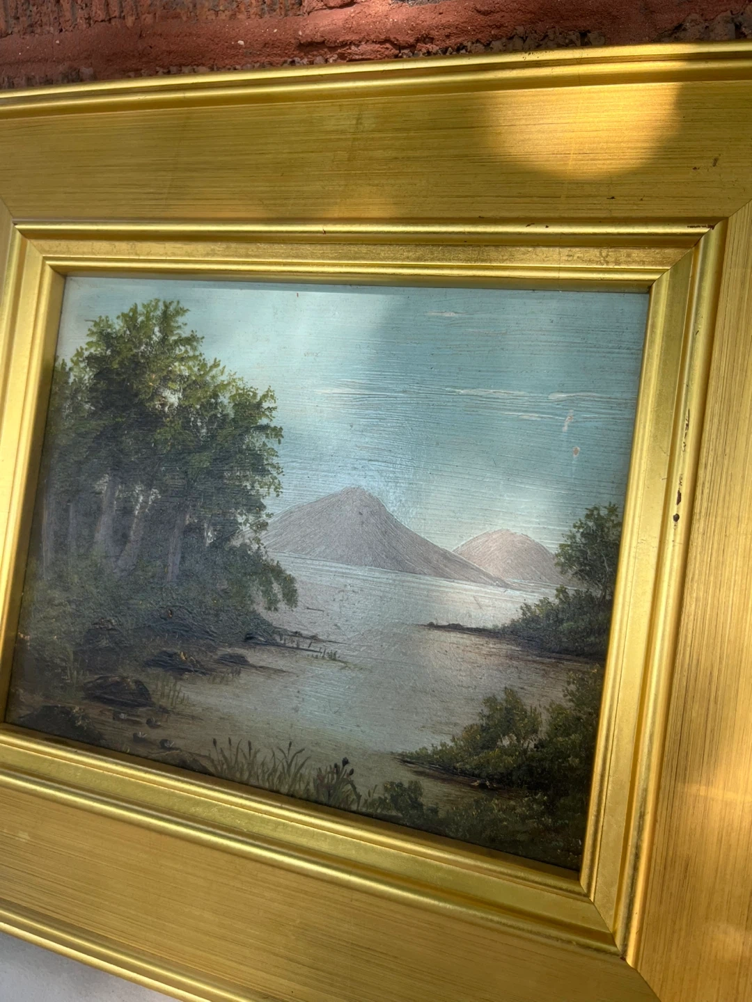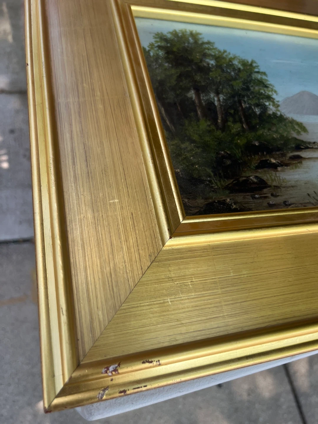 Here's a framed landscape painting, perfect for adding a touch of nature to your home! The frame is a lovely gold color, and the painting depicts a serene lakeside scene with trees and mountains