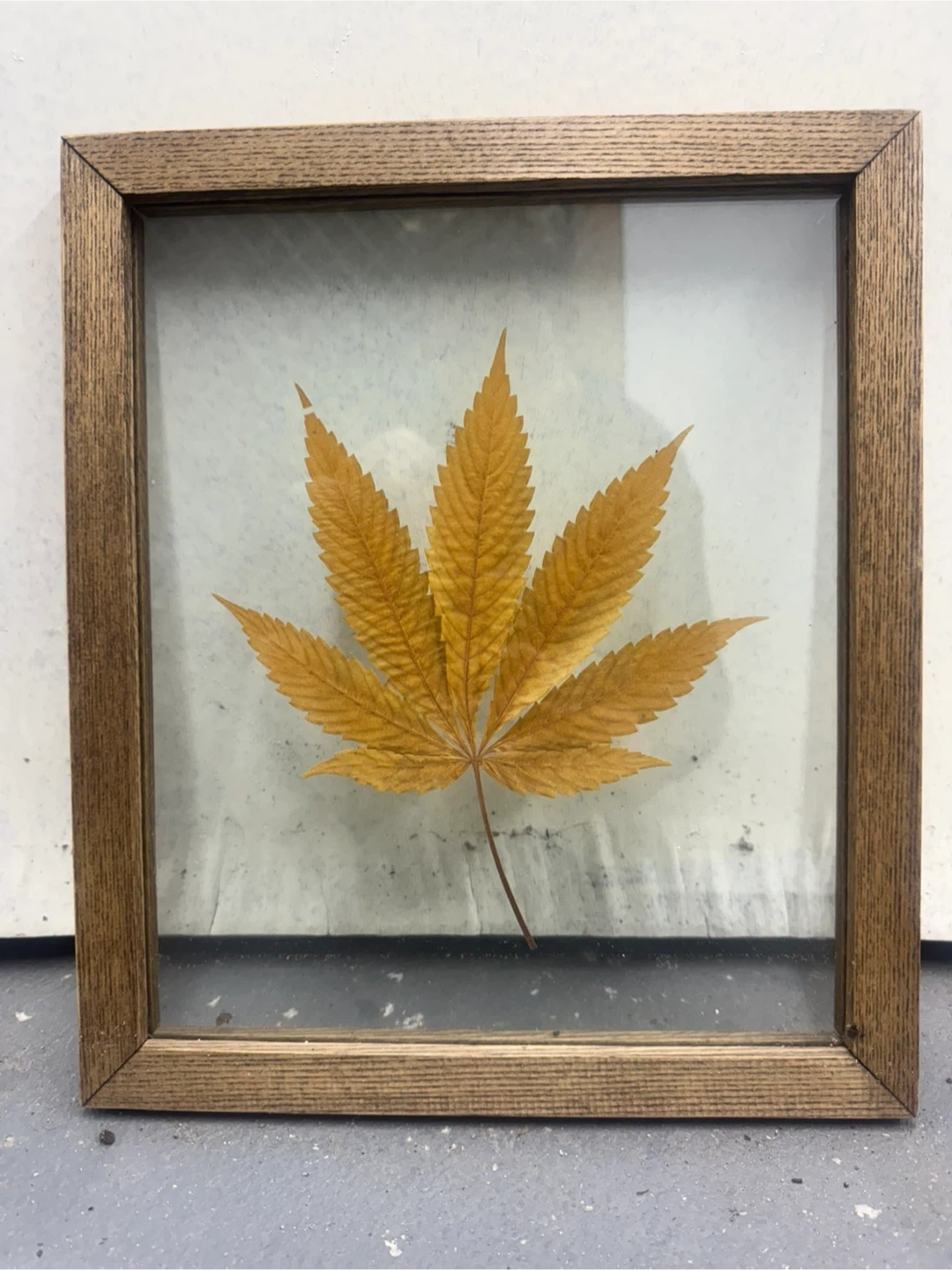 60This is a framed piece of art featuring a Marajuana Art The frame is a simple, light wood tone. It would be a unique addition to your home decor! 12X14 in