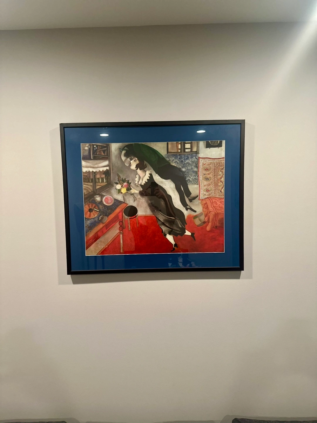 Selling a framed print of a Marc Chagall painting. The frame is black and the print is in great condition! The dimensions are approximately 2'7" by 2'11". The picture is in a glass frame. Smoke free home. Pick up only.