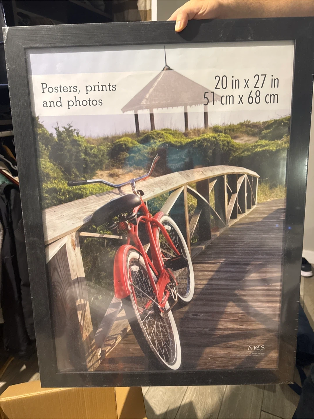 Selling a framed poster print in excellent condition! The dimensions are 20 inches by 27 inches (51 cm x 68 cm). It features a lovely image of a red bicycle on a wooden bridge. Perfect for adding a touch of charm to any room!