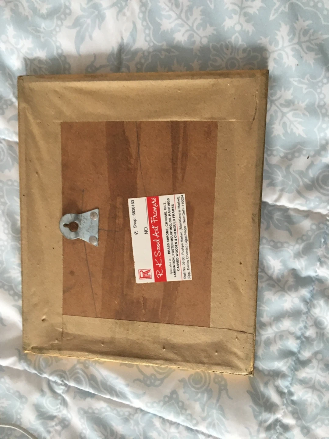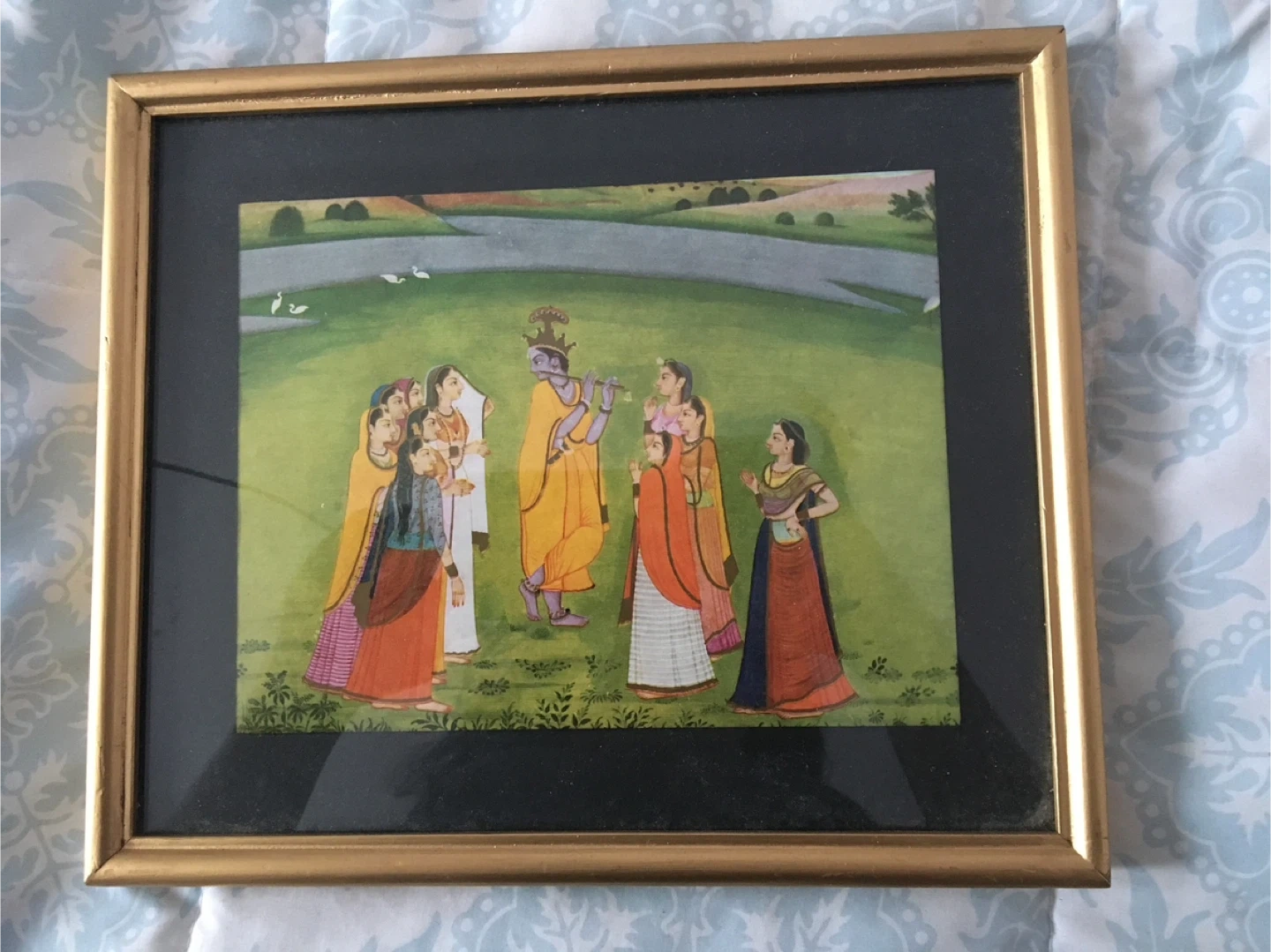 Selling a framed print . The print features a colorful scene with figures. The frame is a gold color. Great piece for adding a touch of art to your space