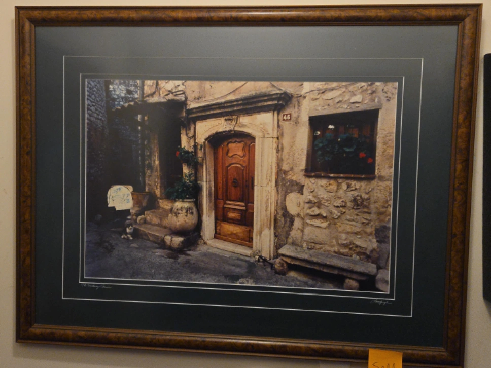 This is a framed print of a stone building with a wooden door and window. The frame is a dark brown color. It would look great in any home!