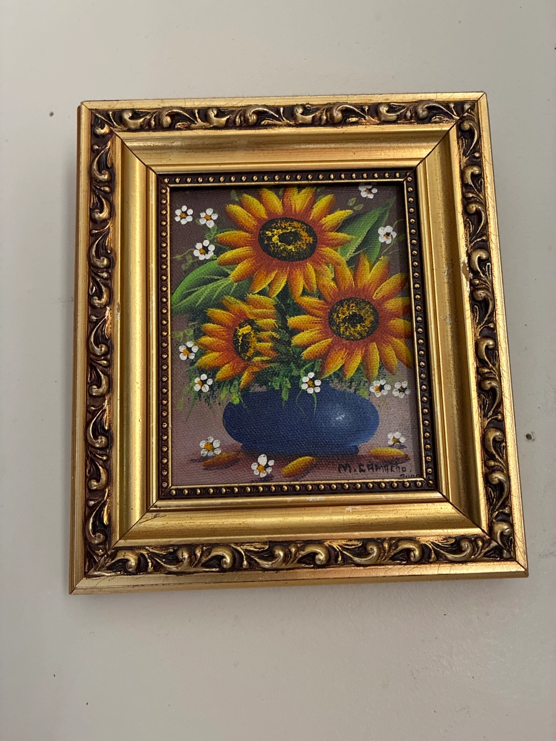 This is a framed painting of sunflowers in a blue vase. It has a gold frame with intricate designs. It would look great in any room