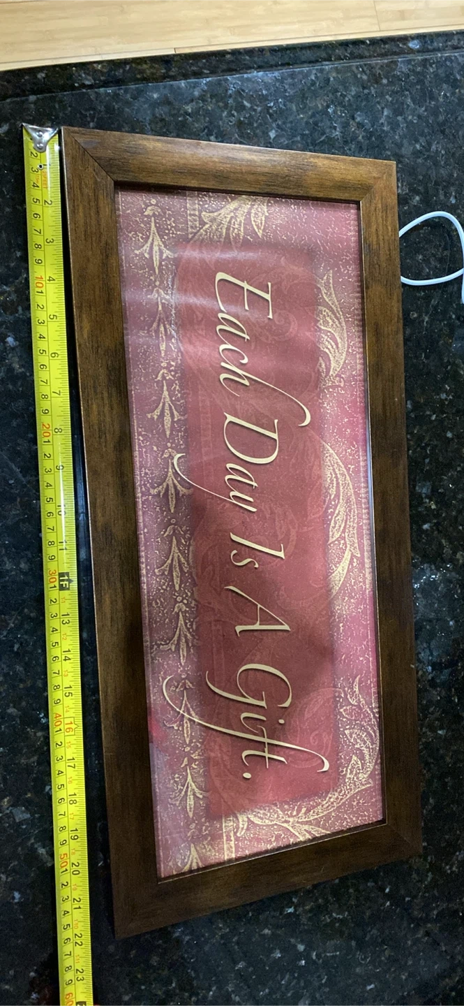 20Framed wall art with the phrase "Each Day Is A Gift" in elegant lettering. The frame is a dark brown wood. The dimensions are approximately 23 inches in length and 10.5 inches in width.