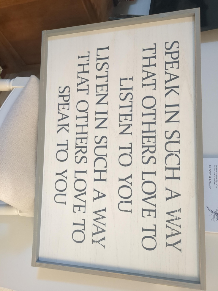 A framed wall art piece featuring the quote: "SPEAK IN SUCH A WAY THAT OTHERS LOVE TO LISTEN TO YOU LISTEN IN SUCH A WAY THAT OTHERS LOVE TO SPEAK TO YOU" It's a nice decorative item for any room. grey wood trim and off white background. Purchased at hobby lobby a few years ago. It hung in my office at work and everyone loved it. Even the COO.