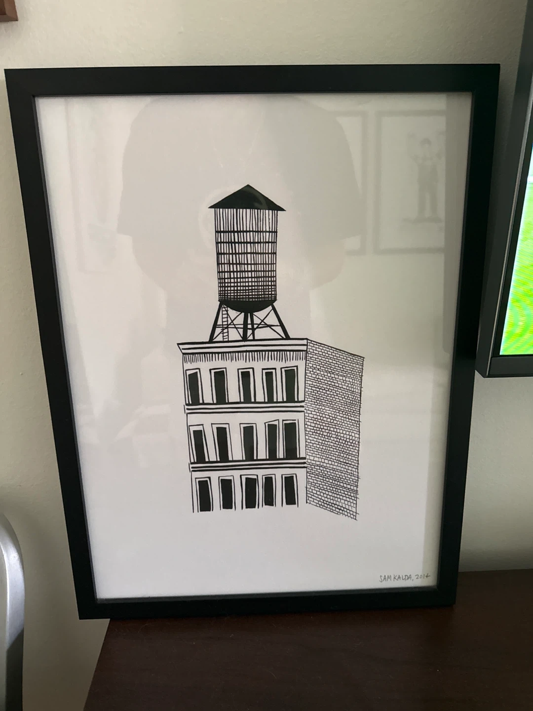 Here's a framed print featuring a water tower design by Sam Kalda. It's a black and white print in a simple black frame. It would be a nice addition to any room!