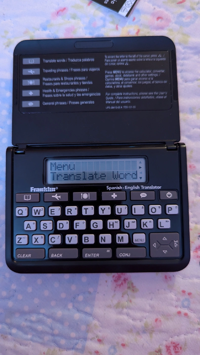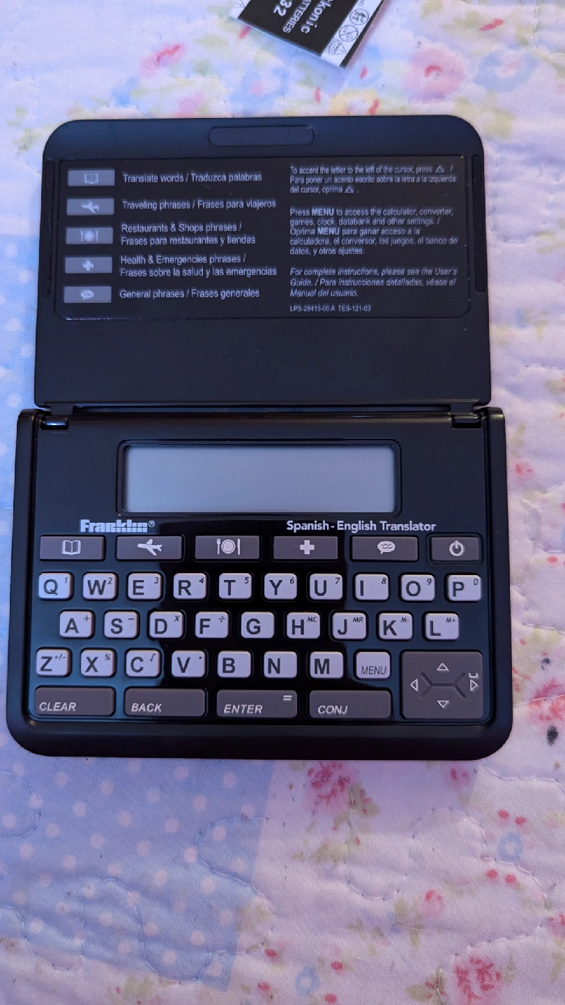 Selling a Franklin Spanish-English Translator. It's in good condition and ready to help you with your language learning needs! It has a QWERTY keyboard for easy typing and various functions to assist with translation. Great for students or travelers!