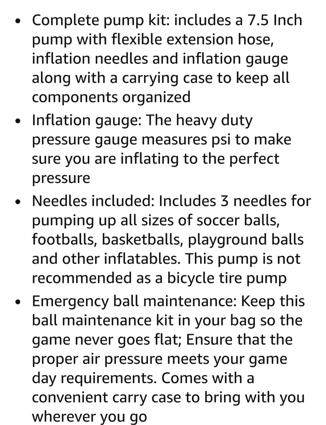 It Includes a 7.5-inch pump with a flexible extension hose and it also comes with a carrying case to keep everything organized. Includes 3 needles for pumping up all sizes of soccer balls, footballs, basketballs, and other inflatables. Only used once.