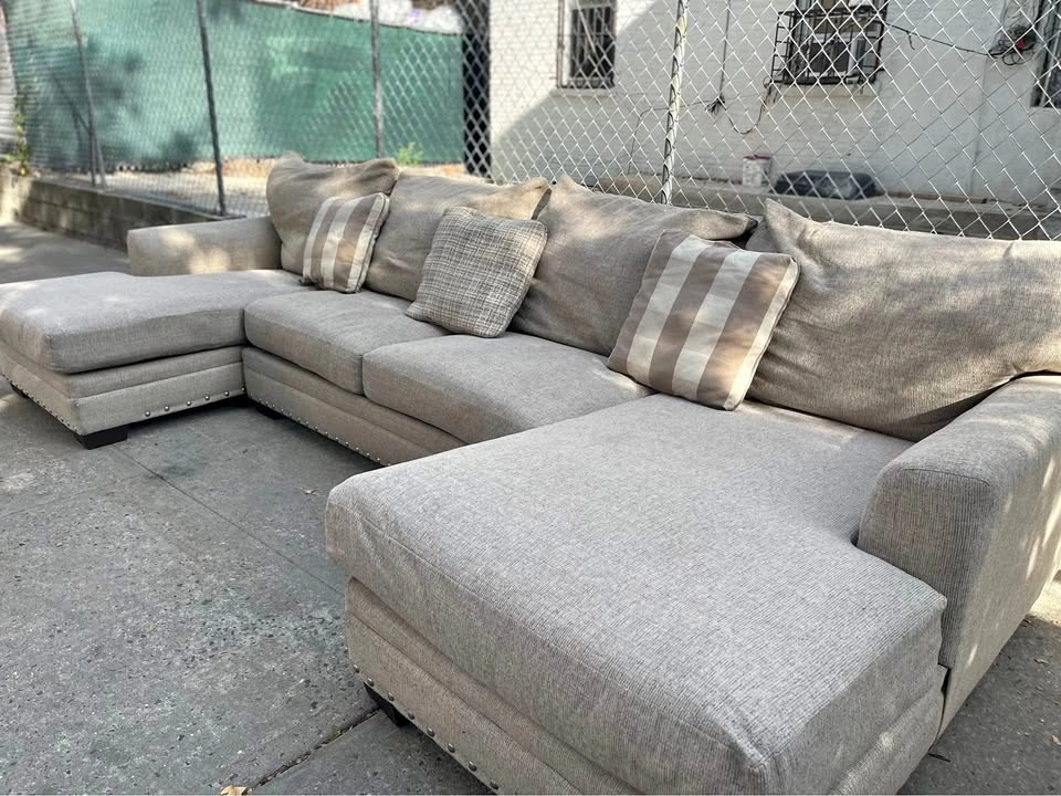 Large sectional with double chaise. Only staged outside for pictures. It is 146” long and the chaise is 67” from back to end. Seat height is 18”. It’s very comfortable. Paid $2500. It comes apart into 3 pieces. Back cushions are sewn in to the back. Seat cushions remove. Pick up available in the Bronx.