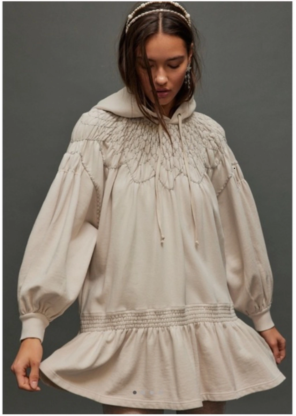 Adorable mini dress. Hooded sweatshirt style. Smocked details. Neutral color. Size medium.
