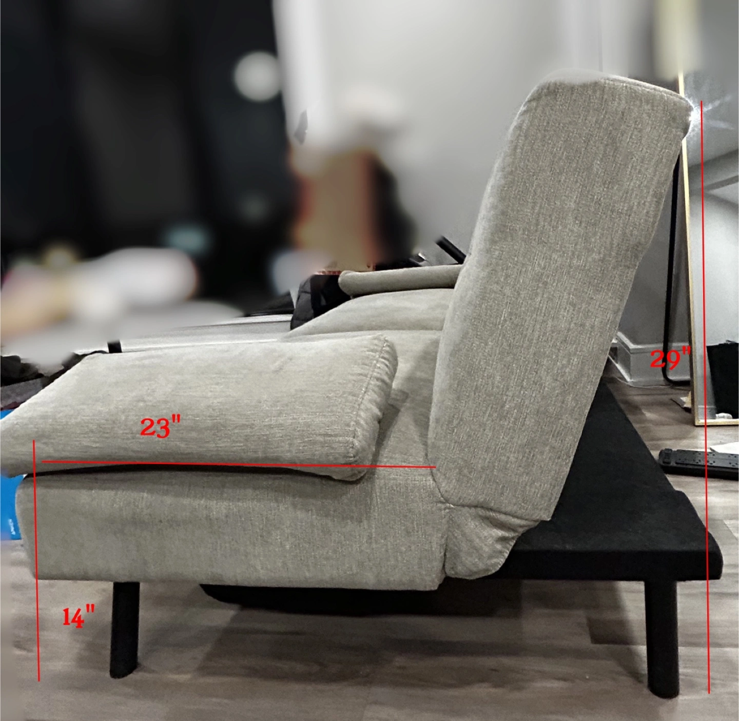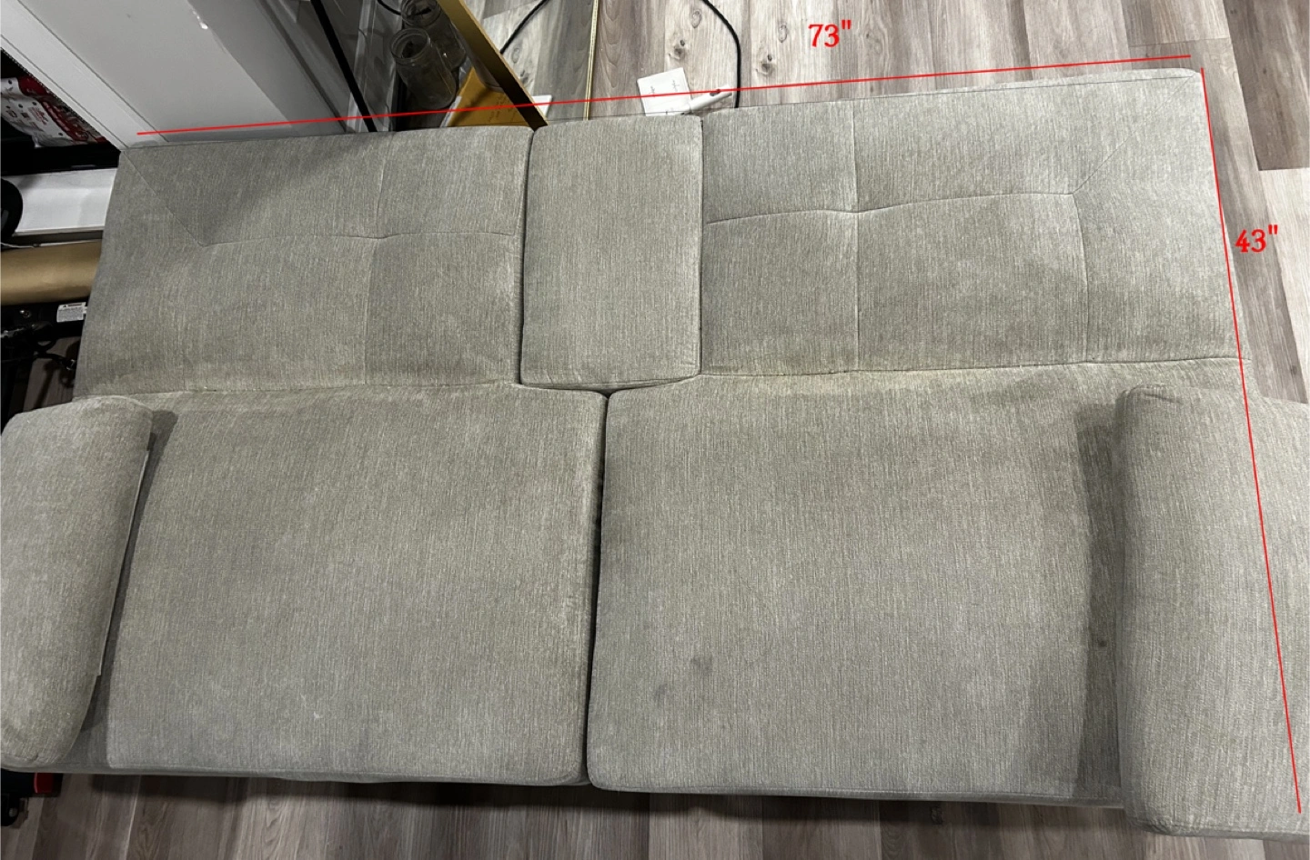 28Selling a gray sofa that's in good condition! It measures 73 inches in length and 43 inches in height. The seat depth is about 23 inches, and the height from the ground to the seat is 14 inches. Perfect for a small apartment or living room