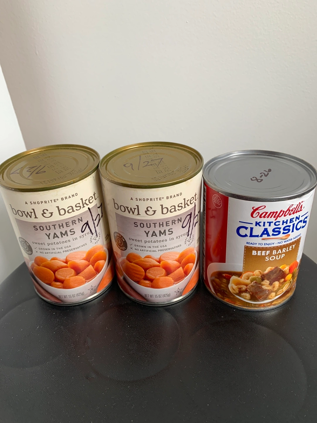 Three cans of food. Two are ShopRite brand Southern Yams, sweet potatoes in syrup. One is Campbell's Kitchen Classics Beef Barley soup. Exp dates 9/27, 8/26