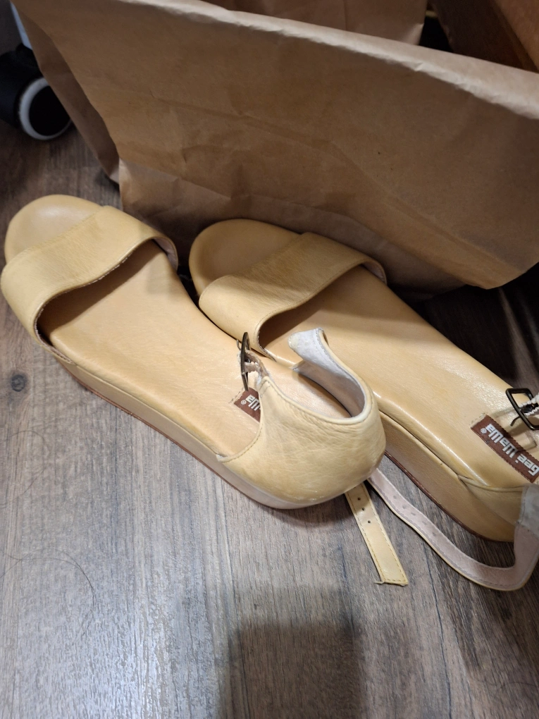 Pair of beige leather wedge sandals. Ankle straps. Slight wear.