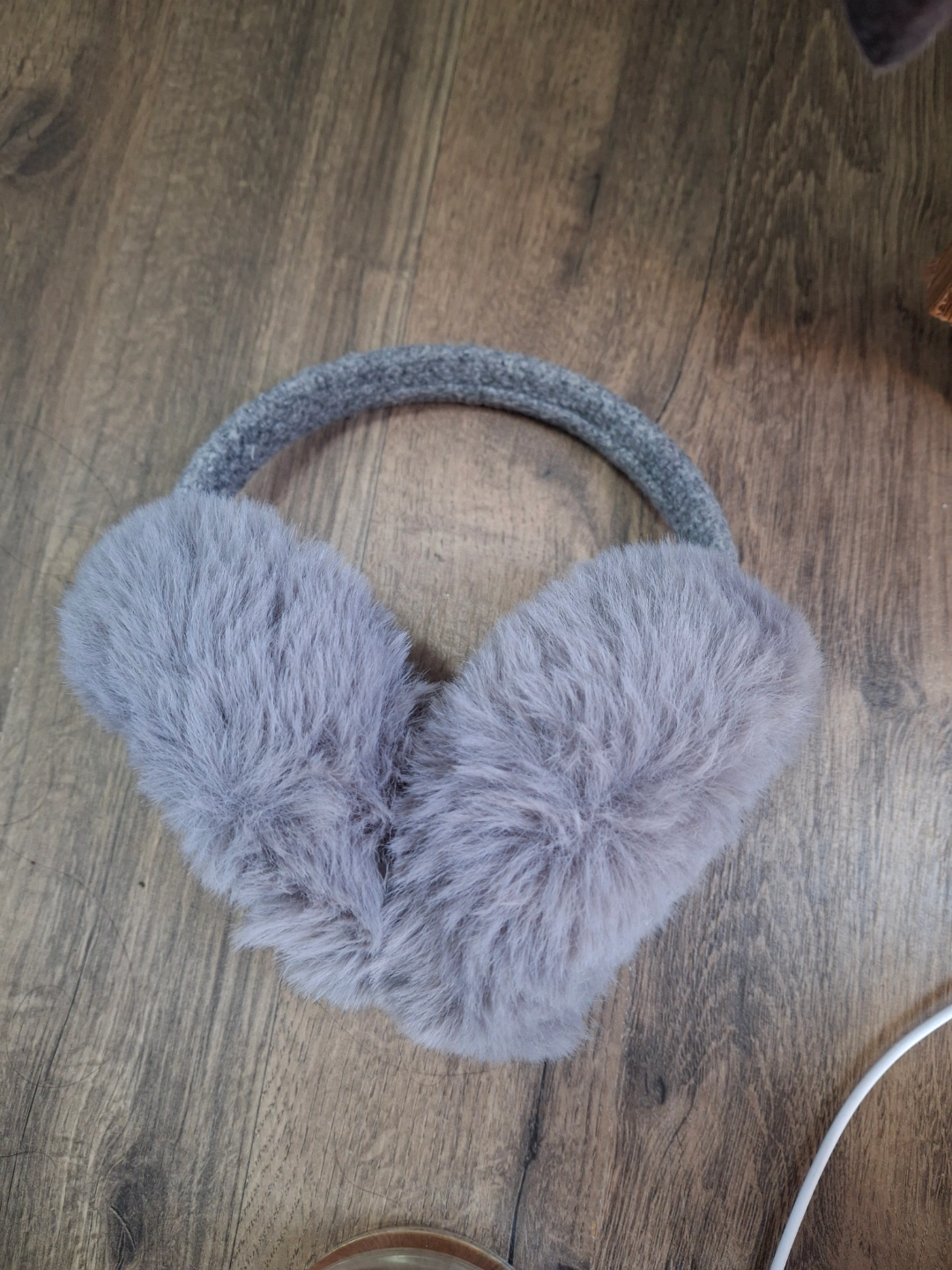 Soft gray earmuffs. Perfect for winter. Fluffy material. Keeps ears warm.