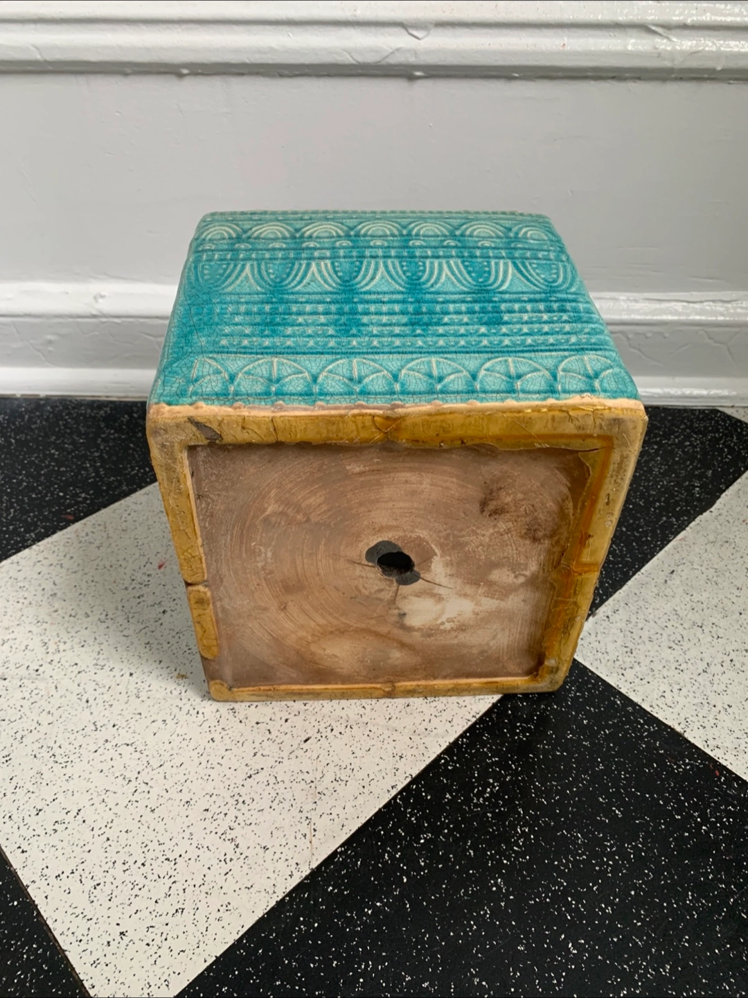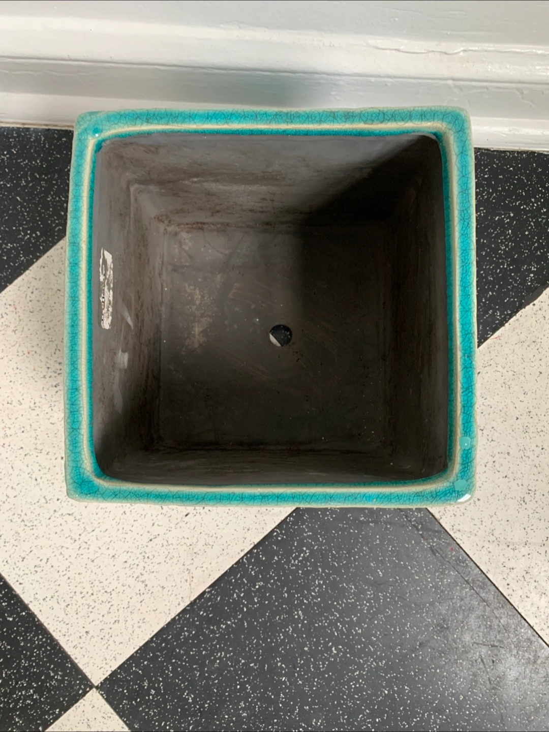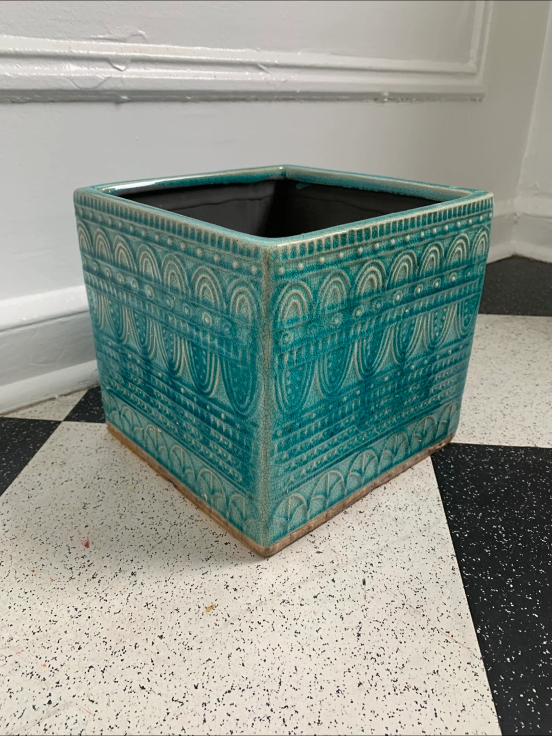 I'm giving away a square planter with a unique turquoise ceramic design! It's perfect for adding a touch of color to your indoor or outdoor space. The planter has a square shape and a decorative pattern around the sides. It's in good condition and ready for a new home for your plants