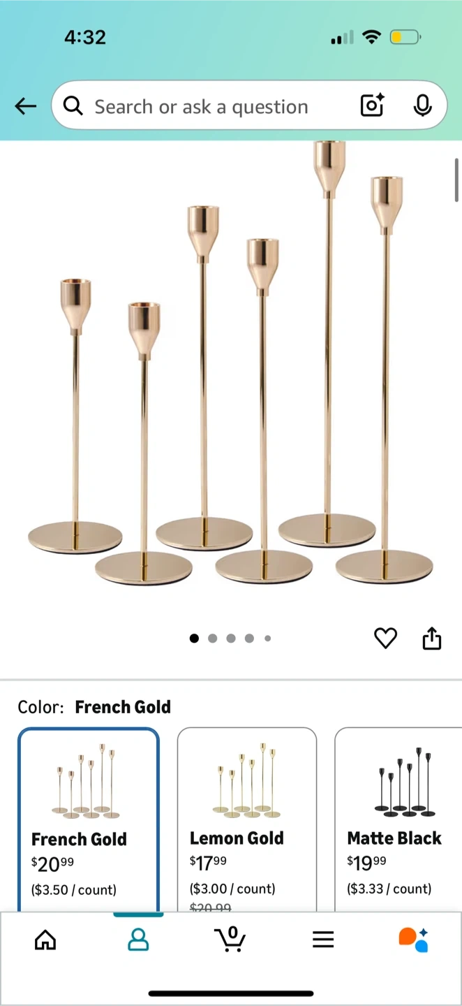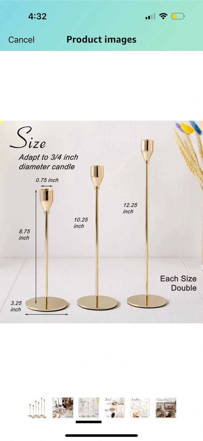 12Selling a set of 6 candle holders in French Gold! They're designed to hold 3/4 inch diameter candles. The set includes varying heights: 8.75 inches, 10.25 inches, and 12.25 inches. They add a touch of elegance to any space!