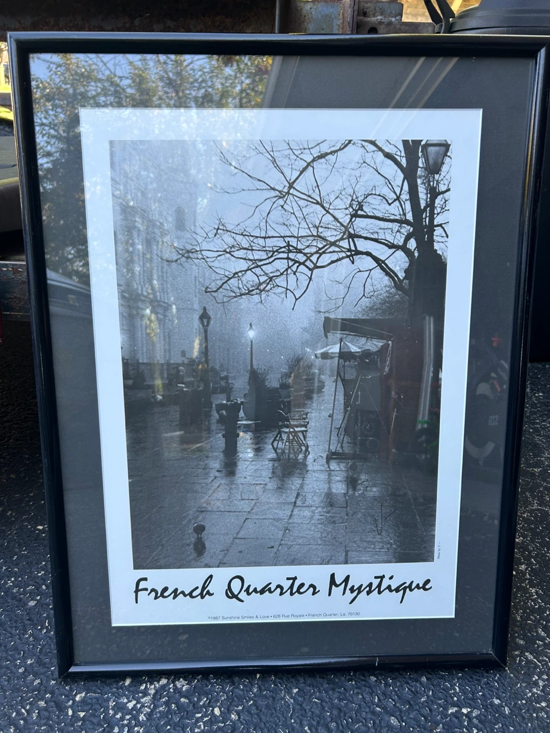 Selling a framed print titled "French Quarter Mystique". It features a black and white image of the French Quarter. The print is framed and ready to hang!