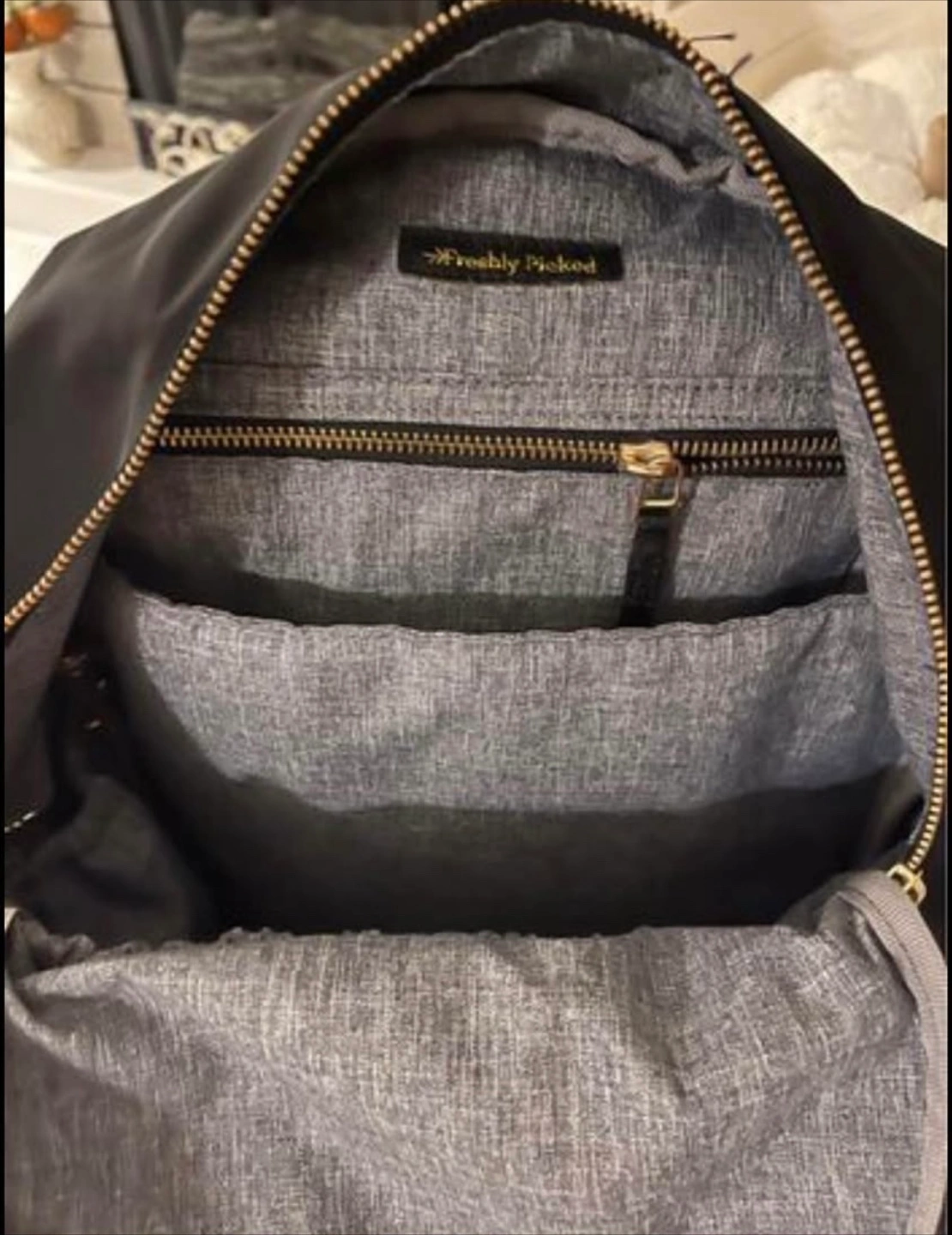 Freshly picked black back pack/diaper bag Durable water resistant fabric Tons of pockets Interior insulated pocket Padded backpack straps for comfort and hands free wear Easy access with wide zippered opening Grab and go top handle Smoke free/pet free home Paid over $125 Can be used just as high end back pack Dual purpose
