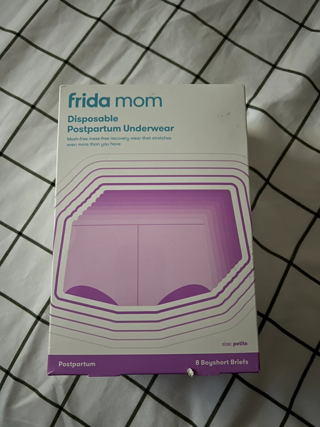 Selling a box of Frida Mom Disposable Postpartum Underwear. They are size petite and contain 8 boyshort briefs. These provide mesh-free, mess-free recovery wear that stretches!