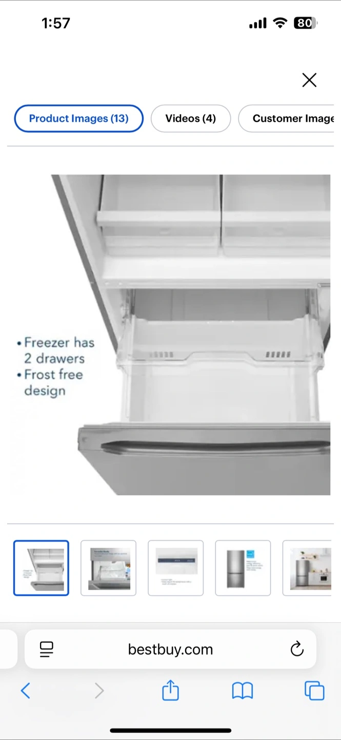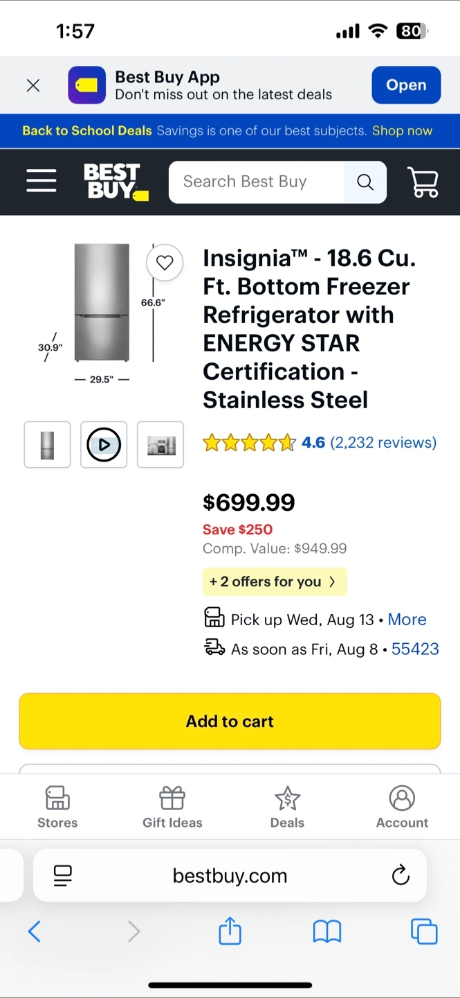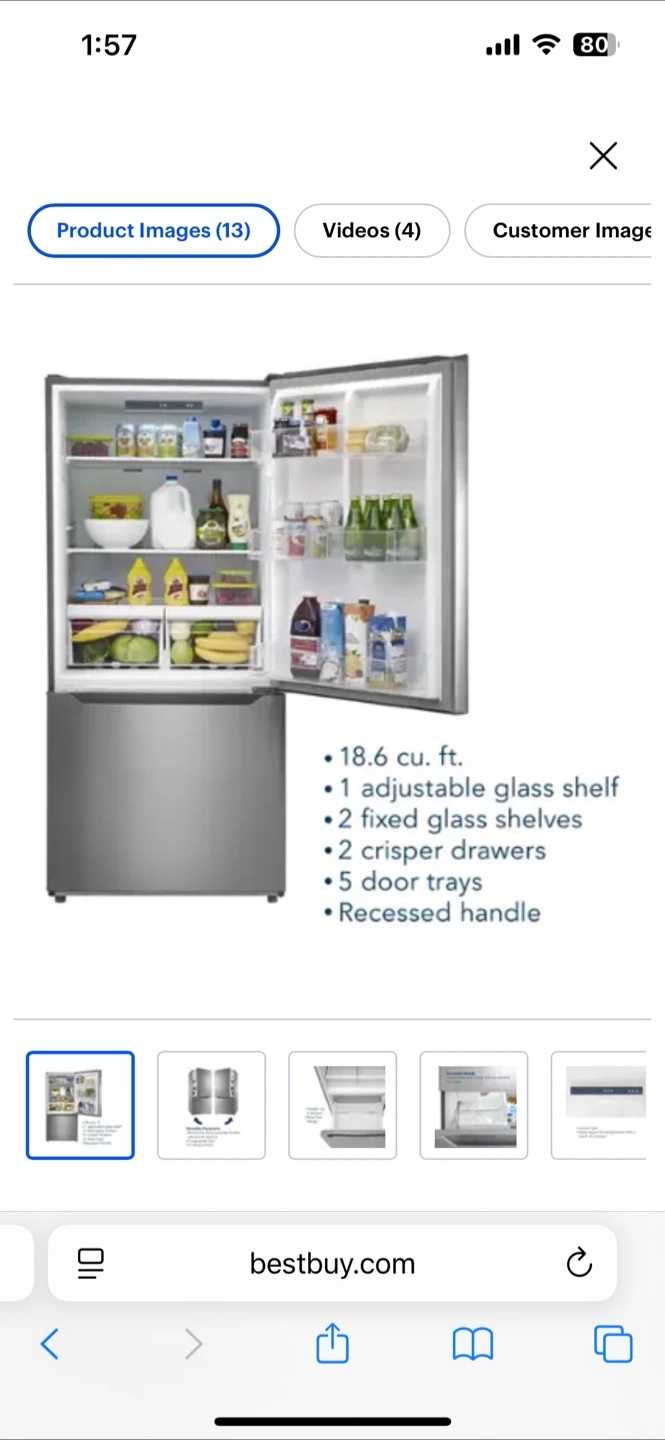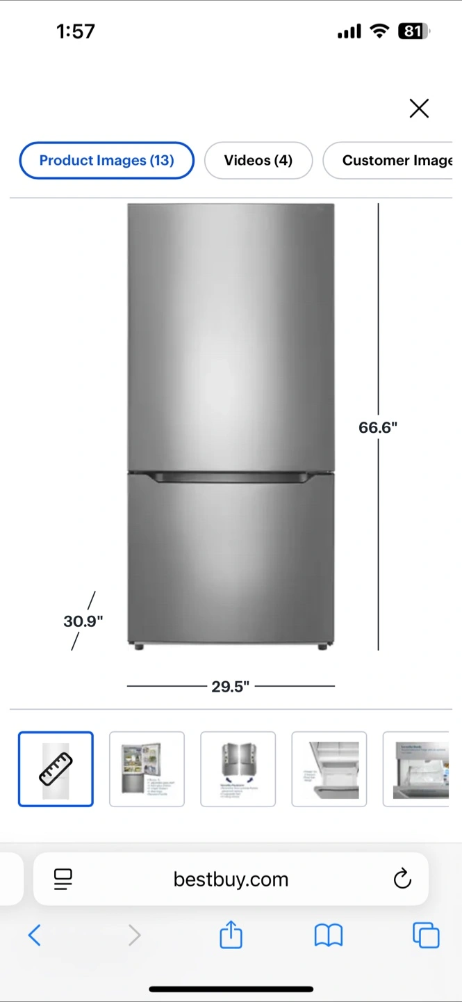 Selling an Insignia 18.6 Cu. Ft. Bottom Freezer Refrigerator with ENERGY STAR Certification in Stainless Steel Key features: - 18.6 cu. ft. - 1 adjustable glass shelf - 2 fixed glass shelves - 2 crisper drawers - 5 door trays - Recessed handle Dimensions: - 66.6" height - 30.9" depth - 29.5" width