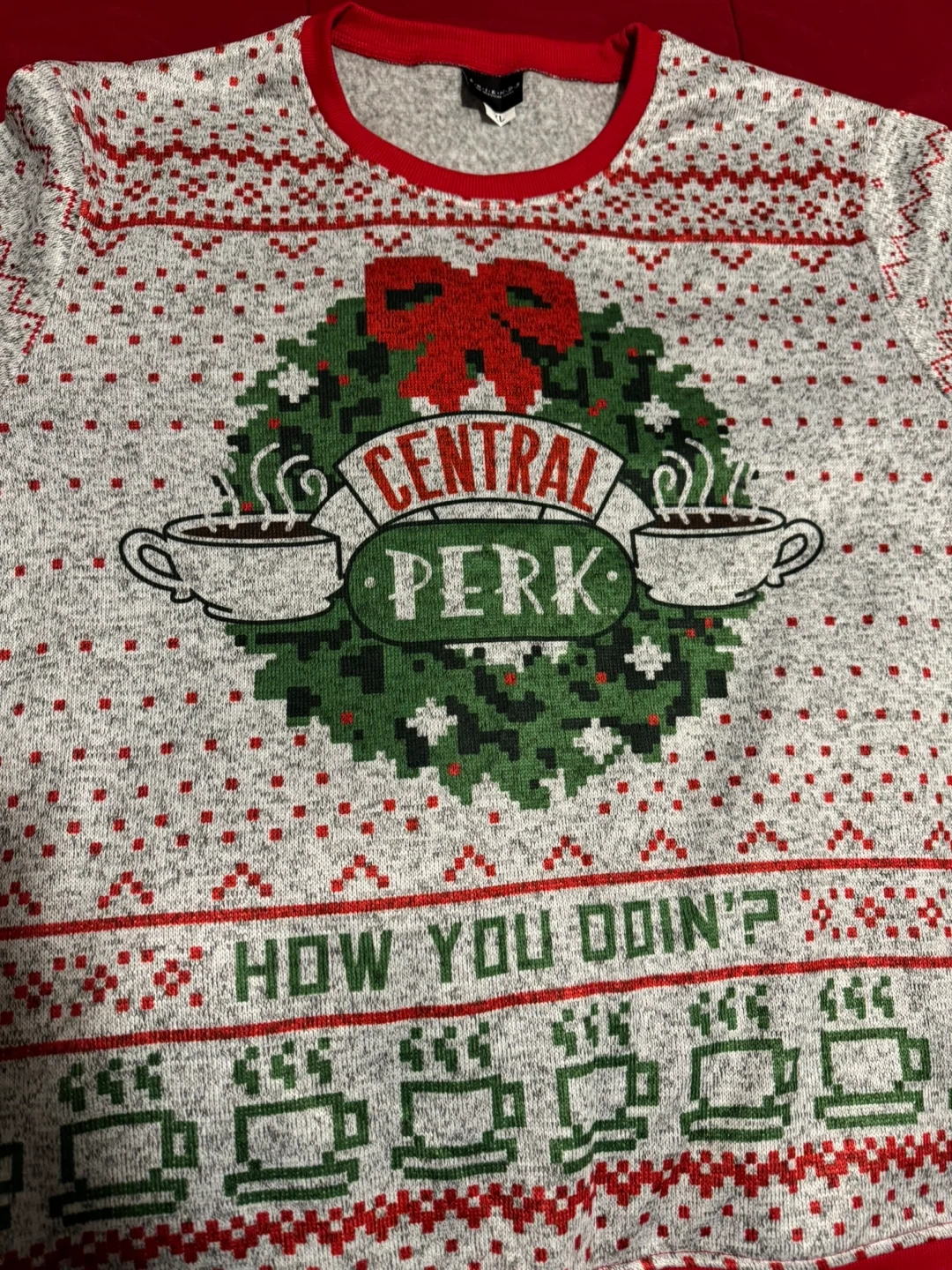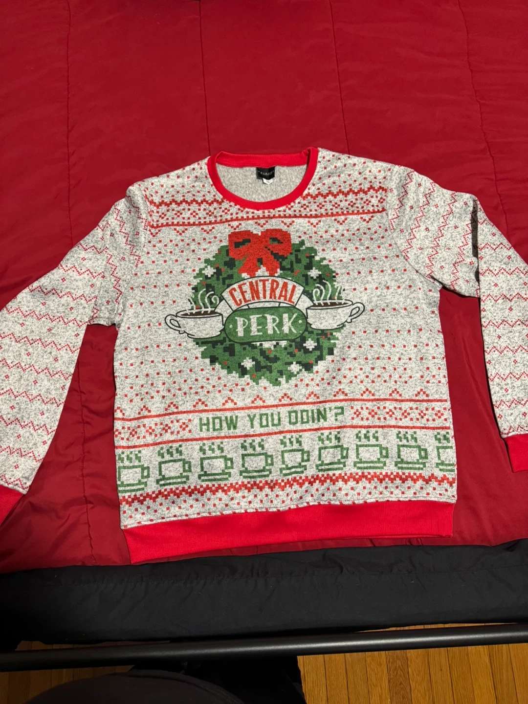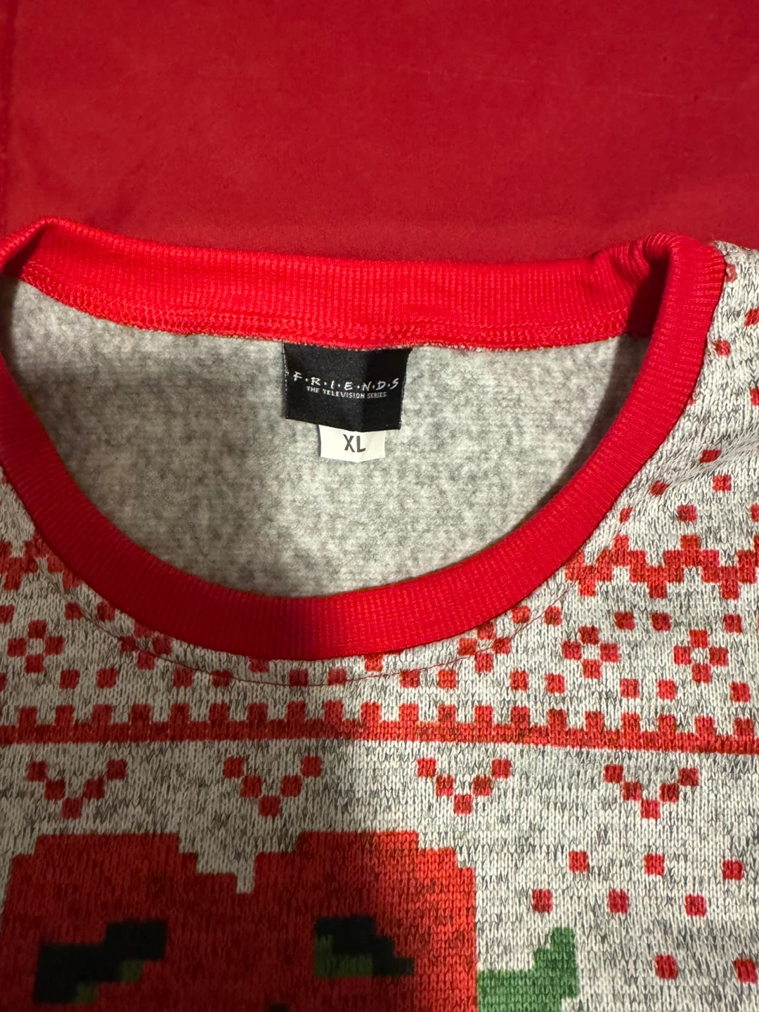 Cozy Friends themed sweater featuring the Central Perk logo! It's an XL and has a fun, festive design. Perfect for any Friends fan!