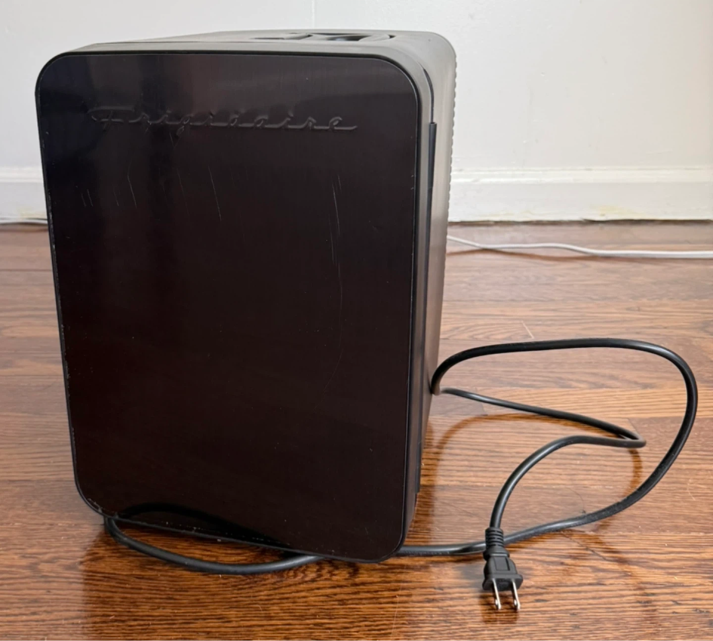 Selling a Frigidaire portable mini fridge in black. It's perfect for keeping drinks and snacks cool in your room or office. It's in great condition and ready for a new home!