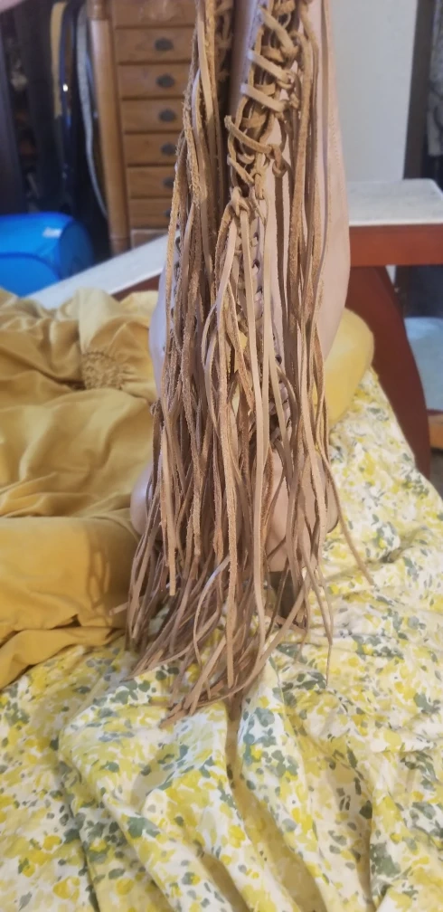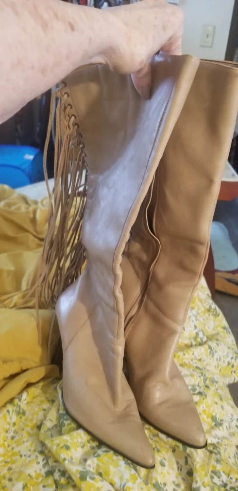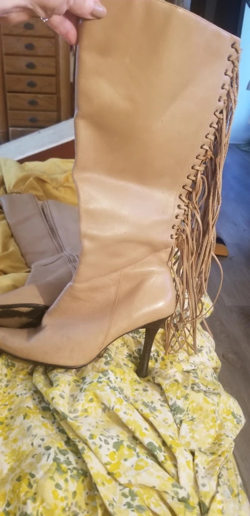 used fringe knee high tan boots from two lips. these are vintage size 6 3.5 inch heel. These were mine but I can no longer wear high heels. these zip on side. Really cute fashion boots
