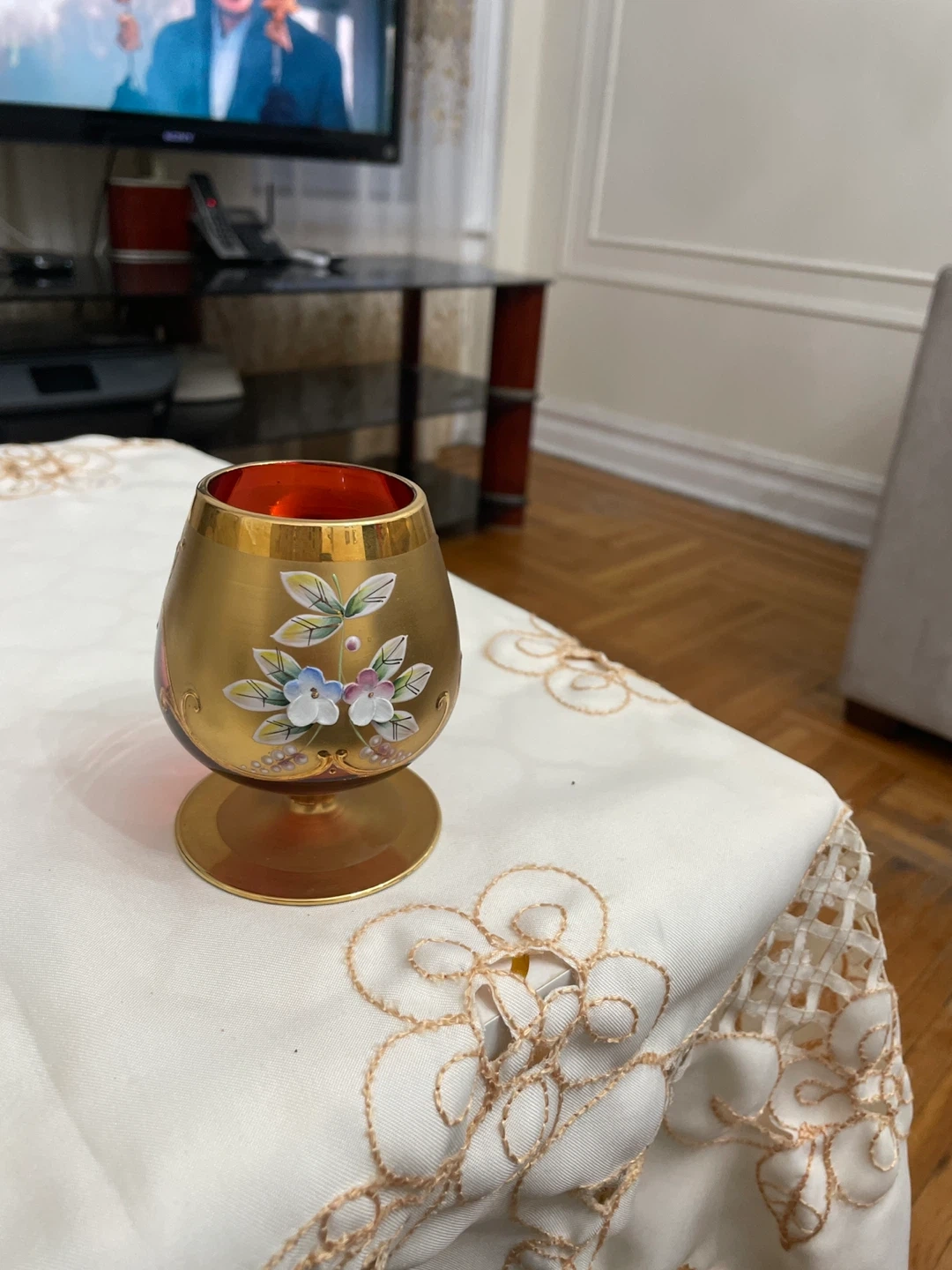 Beautiful goblet with a gold finish and hand-painted floral accents. It has a vibrant red interior and a classic stemmed base. Made of glass.