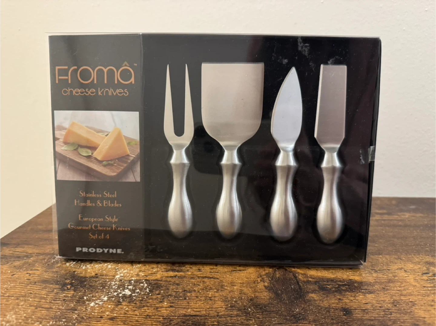 68Selling a brand new set of Froma cheese knives by Prodyne! This set includes four stainless steel knives with European-style handles and blades. Perfect for any cheese lover!