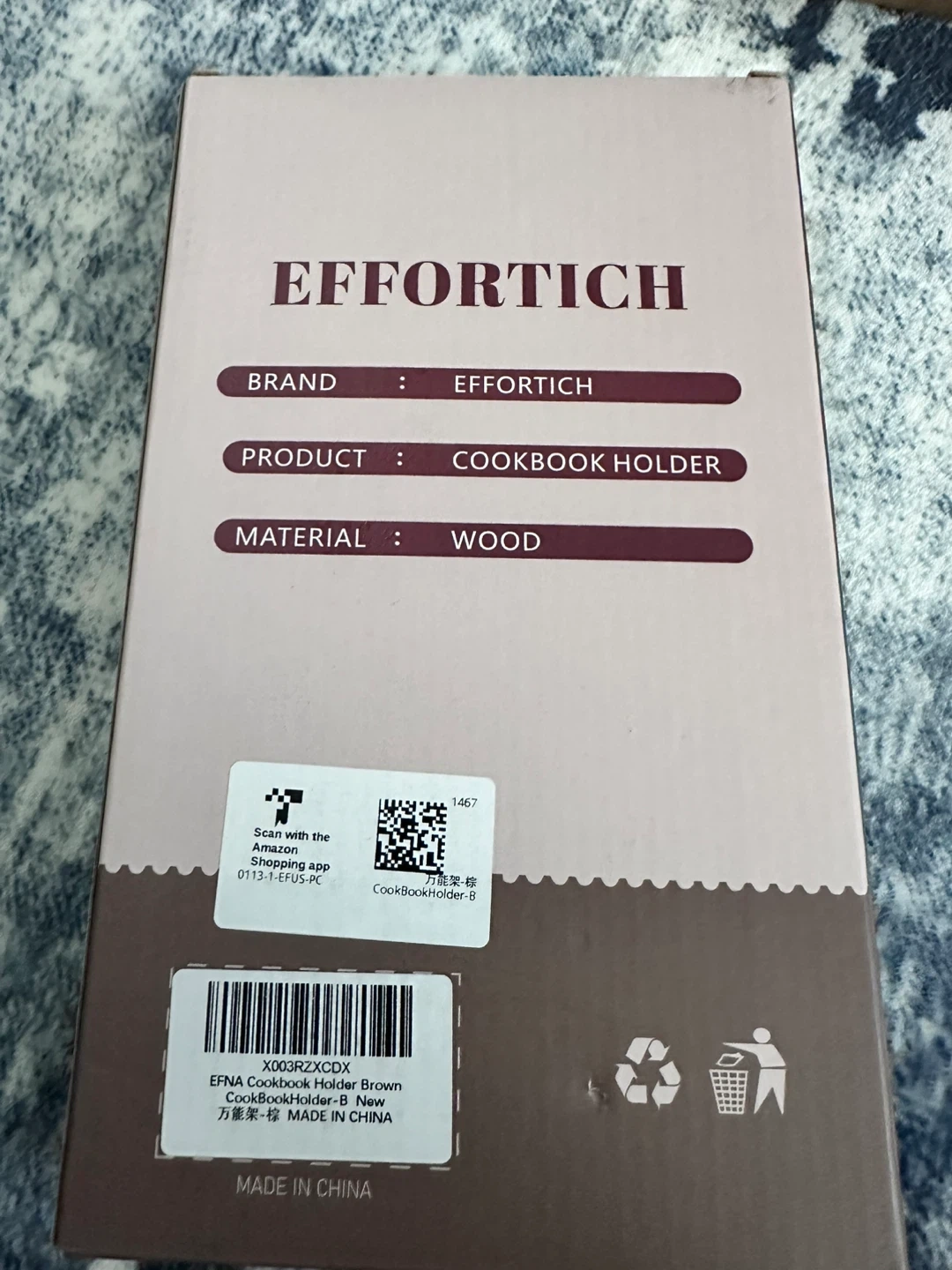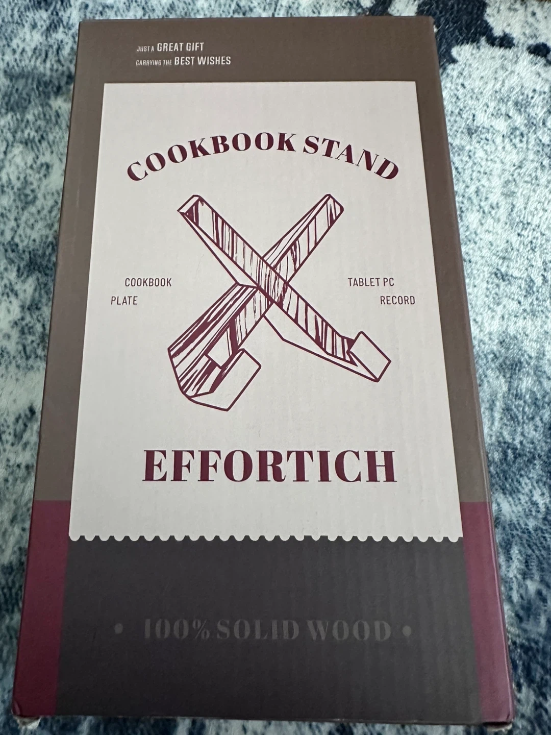 This is an Effortich cookbook stand. It's made of 100% solid wood and includes a cookbook plate. This stand is useful for holding cookbooks or a tablet PC while cooking.