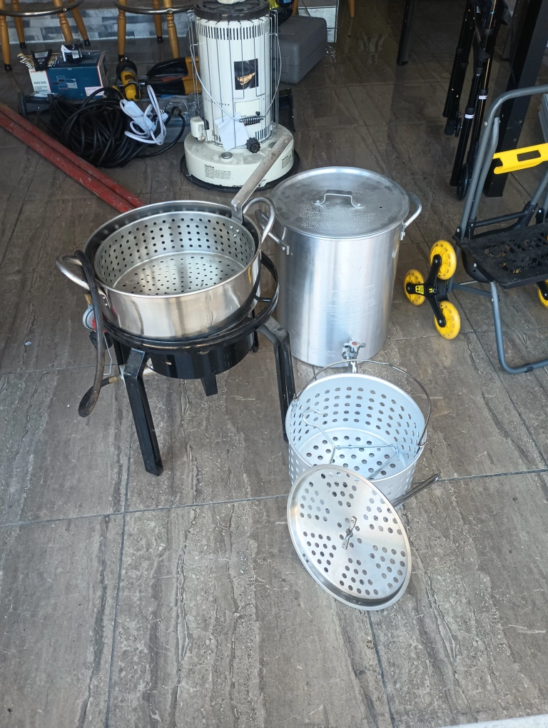 Large aluminum stock pot with lid. Stainless steel steamer basket and burner.