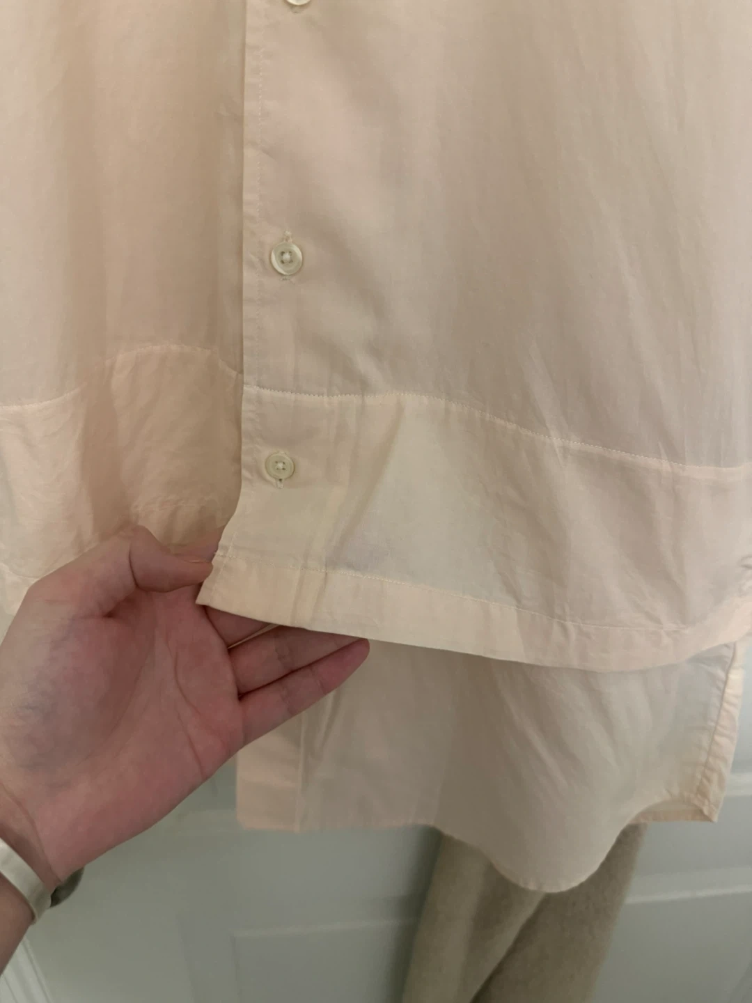 Light peach/beige short sleeve button-up shirt is from MATTHEW MILLER. It's a pale peach color with a classic collar and faux layered design at hem. Size M, slim fit. Pick up from queens elmhurst