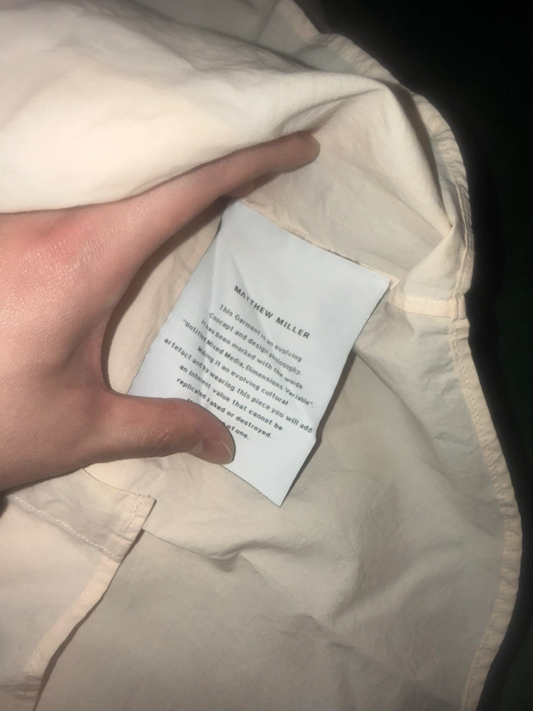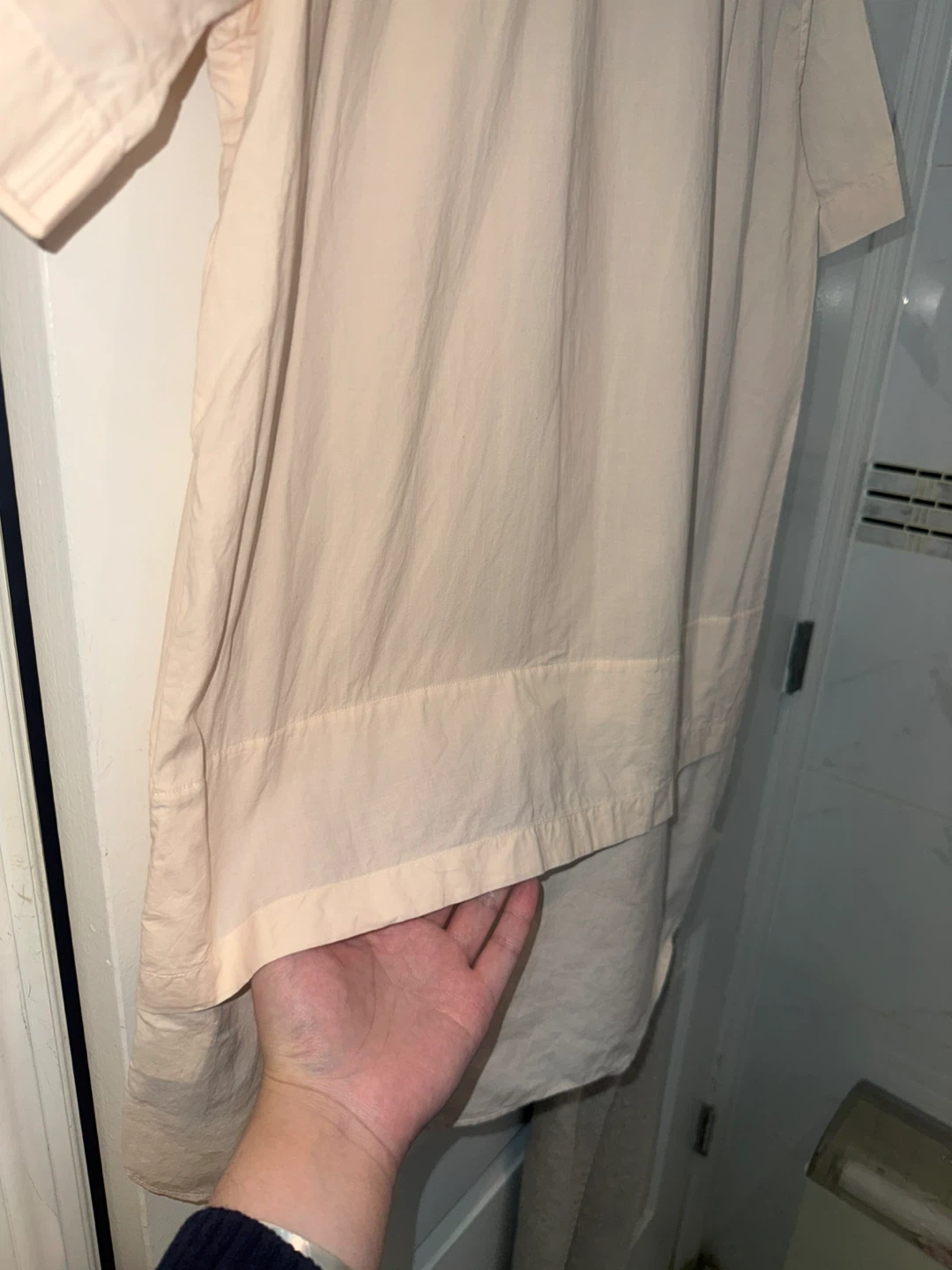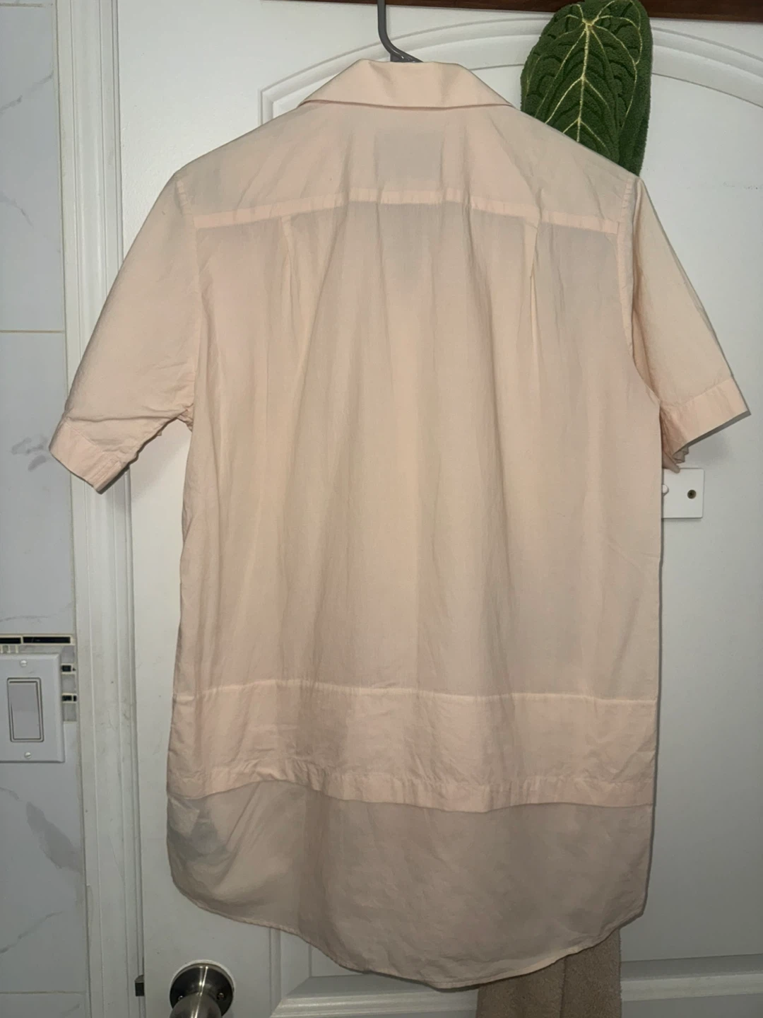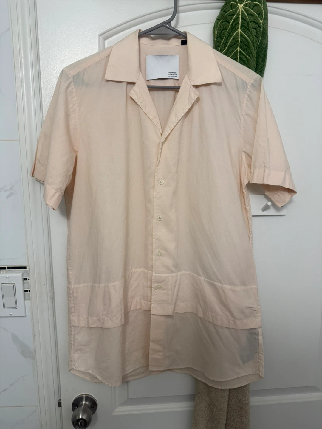 Light peach/beige short sleeve button-up shirt is from MATTHEW MILLER. It's a pale peach color with a classic collar and faux layered design at hem. Size M, slim fit. Pick up from queens elmhurst