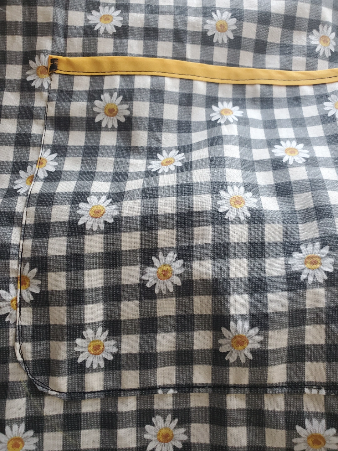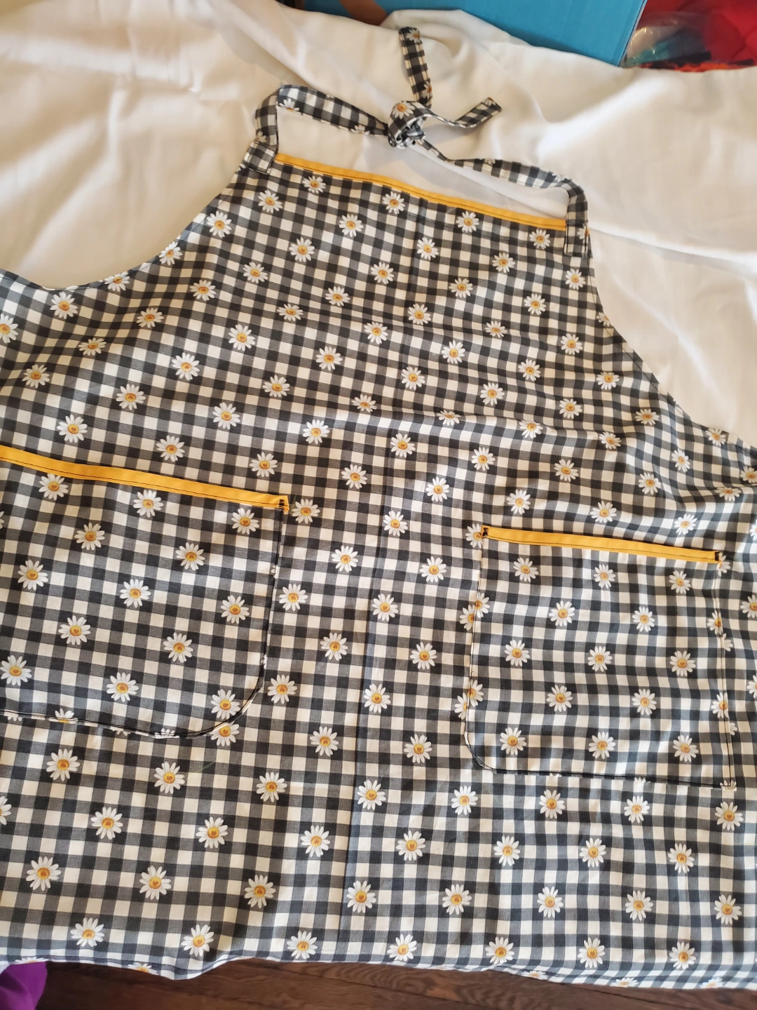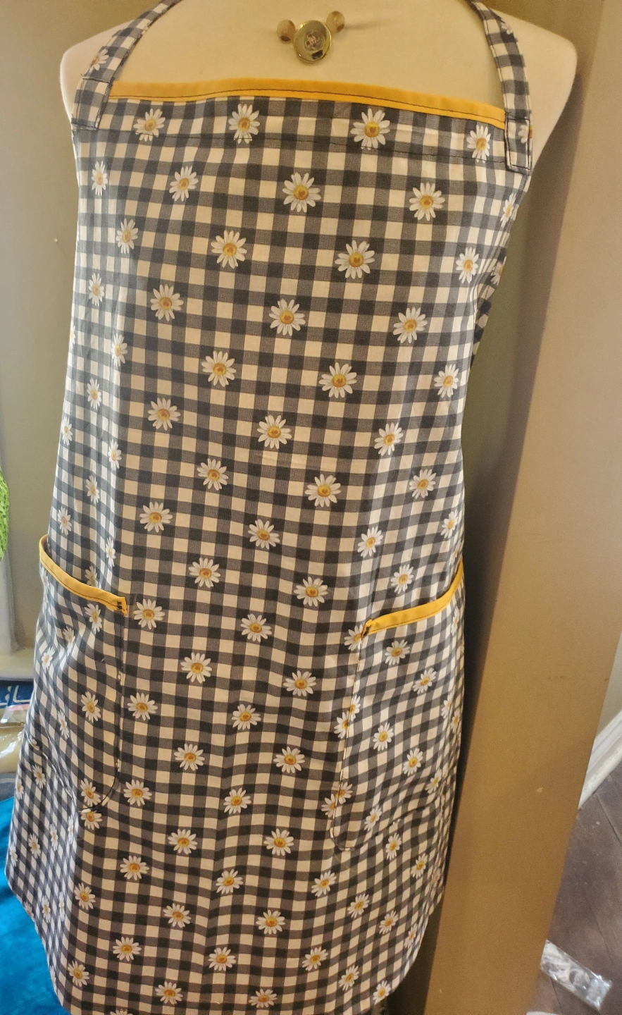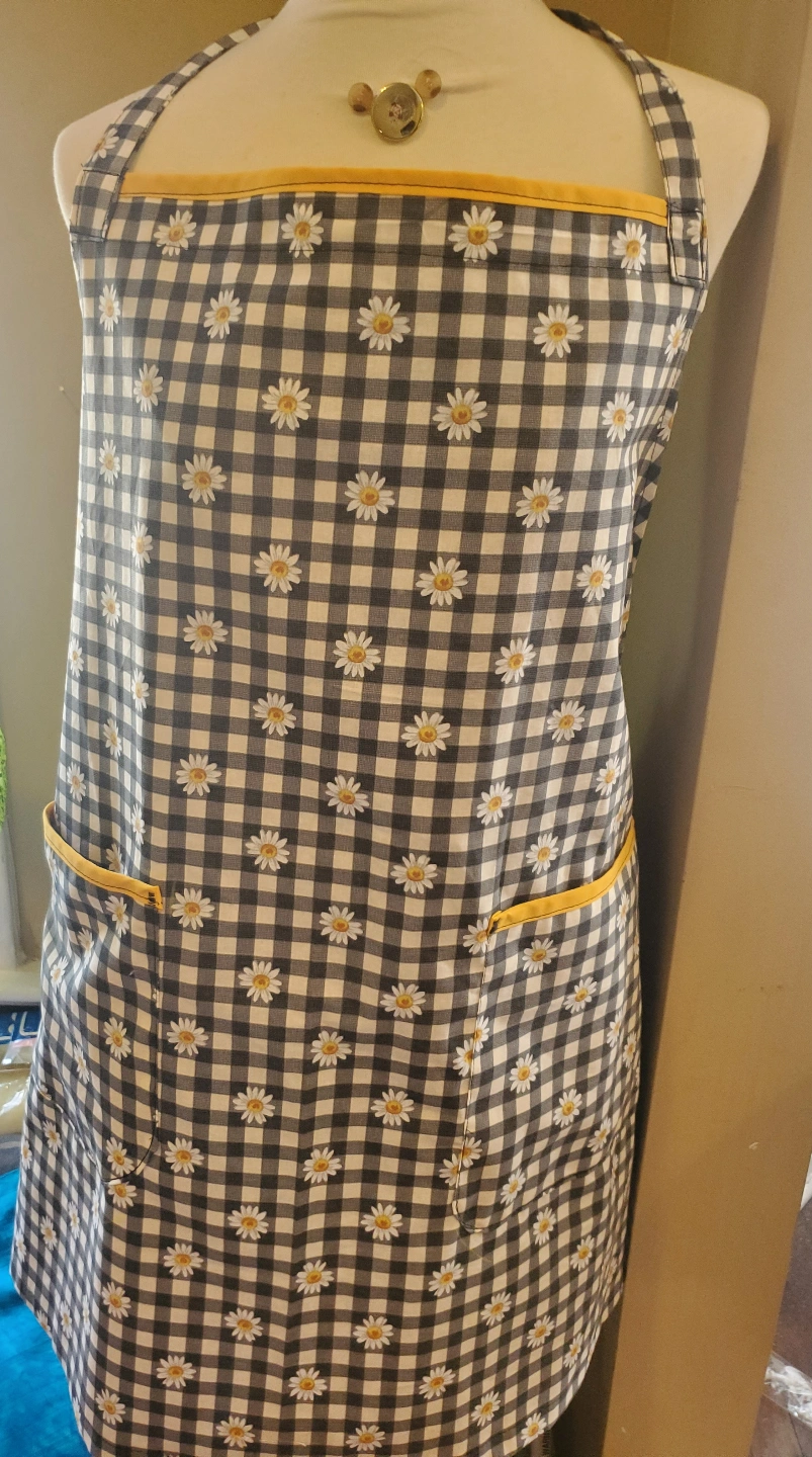 Adorable hand Crafted Cotton apron. Features a black and white gingham pattern with small daisies. Yellow accents. Two pockets reinforced pockets and ties