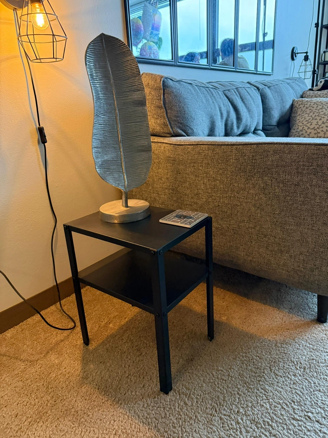 A simple black metal side table with two shelves. It's perfect for holding a lamp, books, or drinks next to a sofa. Its compact design fits well in smaller spaces. Made of metal.