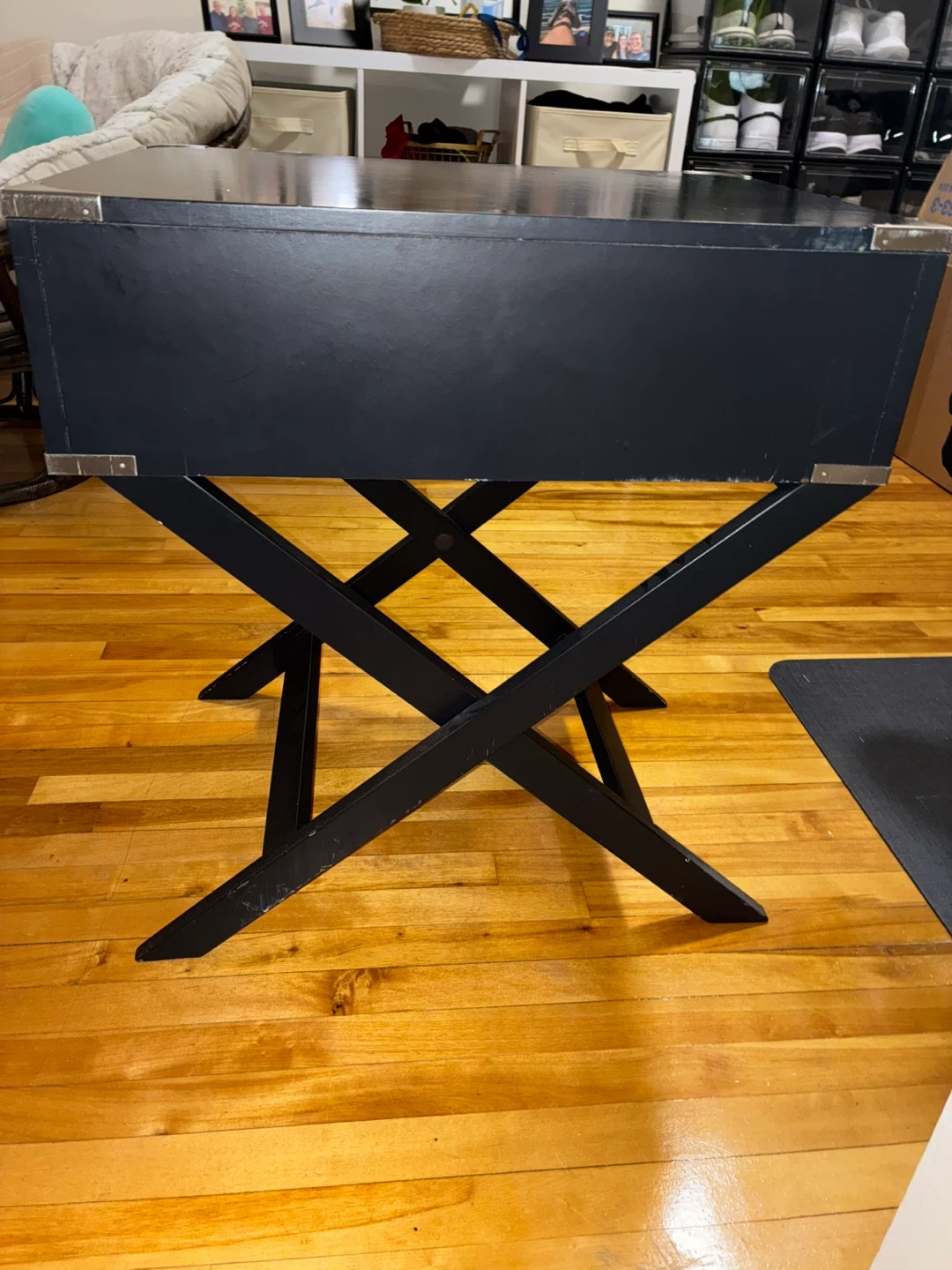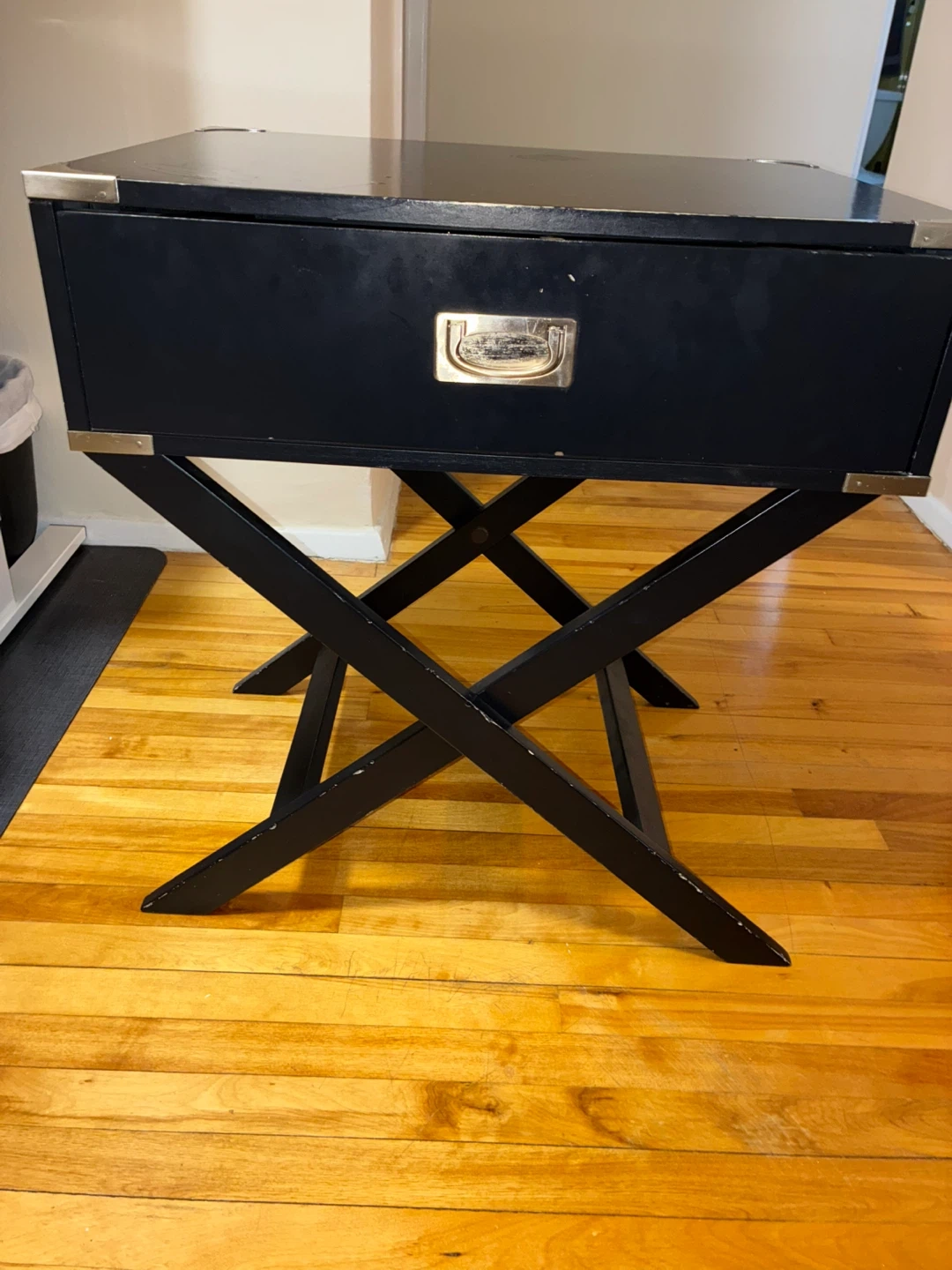 Campaign style side table in black with brass accents and a single drawer. It features a foldable X-base stand for portability. Measurements: 28 inches high, 26 inches wide, 15.5 inches deep.