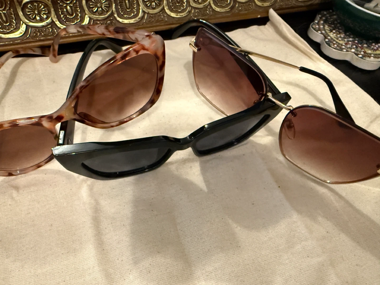 Three pairs of stylish sunglasses. Includes one pair with a tortoise shell pattern, one pair of black cat-eye sunglasses, and one pair with gold metal accents and gradient lenses. A nice selection for sunny days!