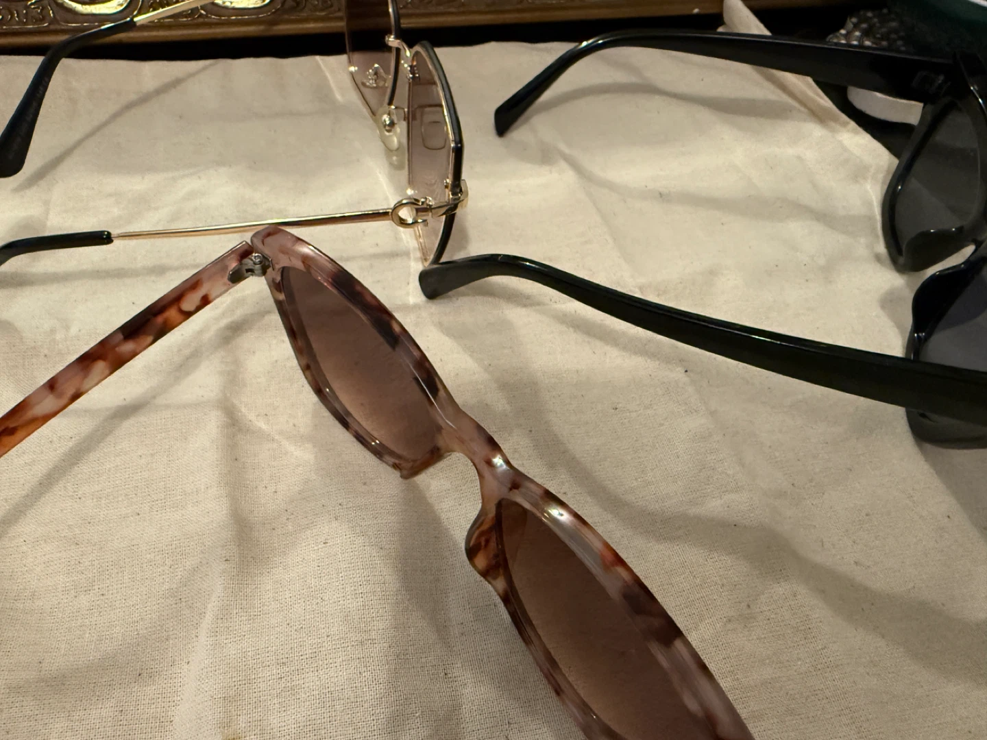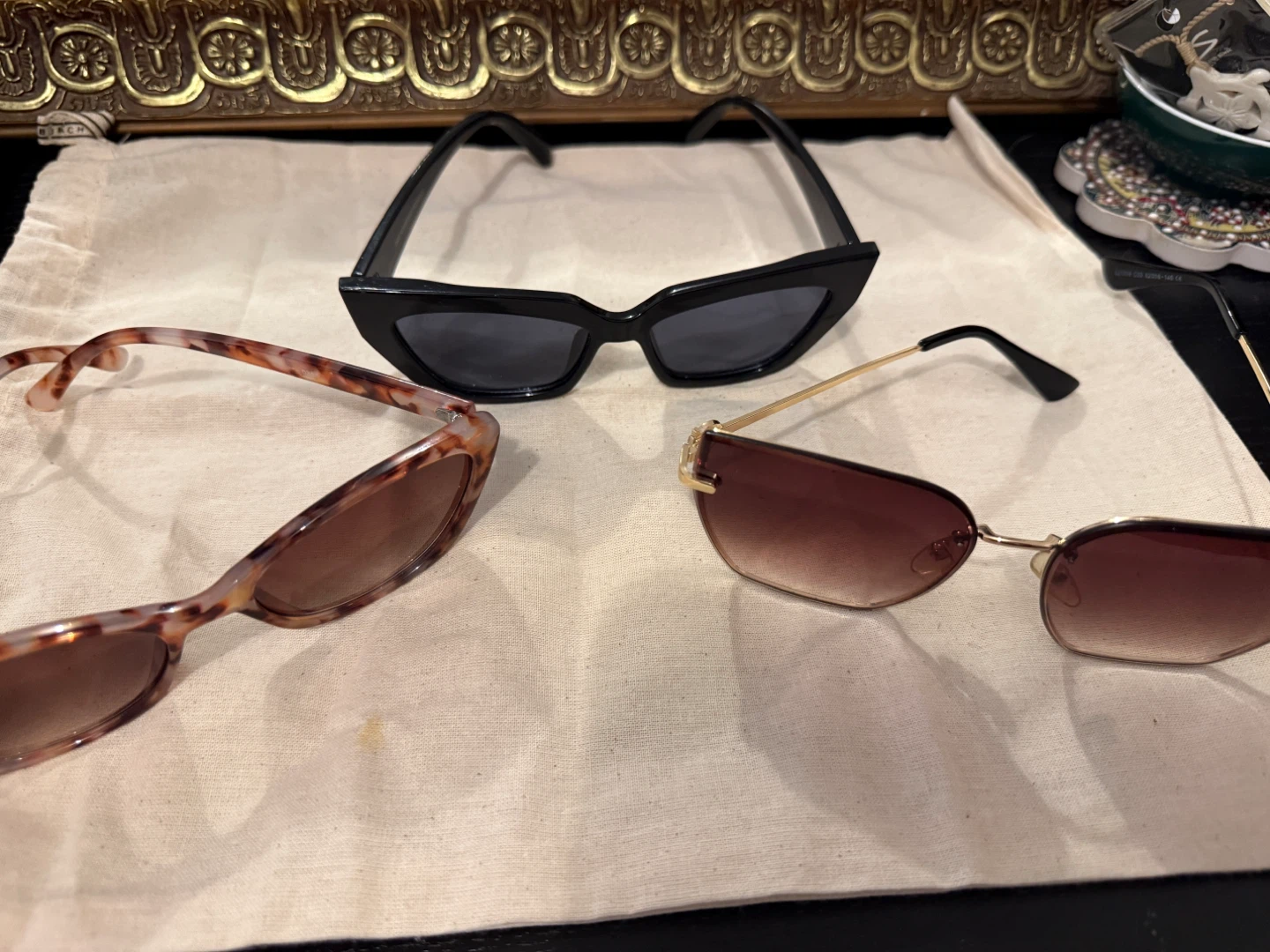 Three pairs of stylish sunglasses. Includes one pair with a tortoise shell pattern, one pair of black cat-eye sunglasses, and one pair with gold metal accents and gradient lenses. A nice selection for sunny days!