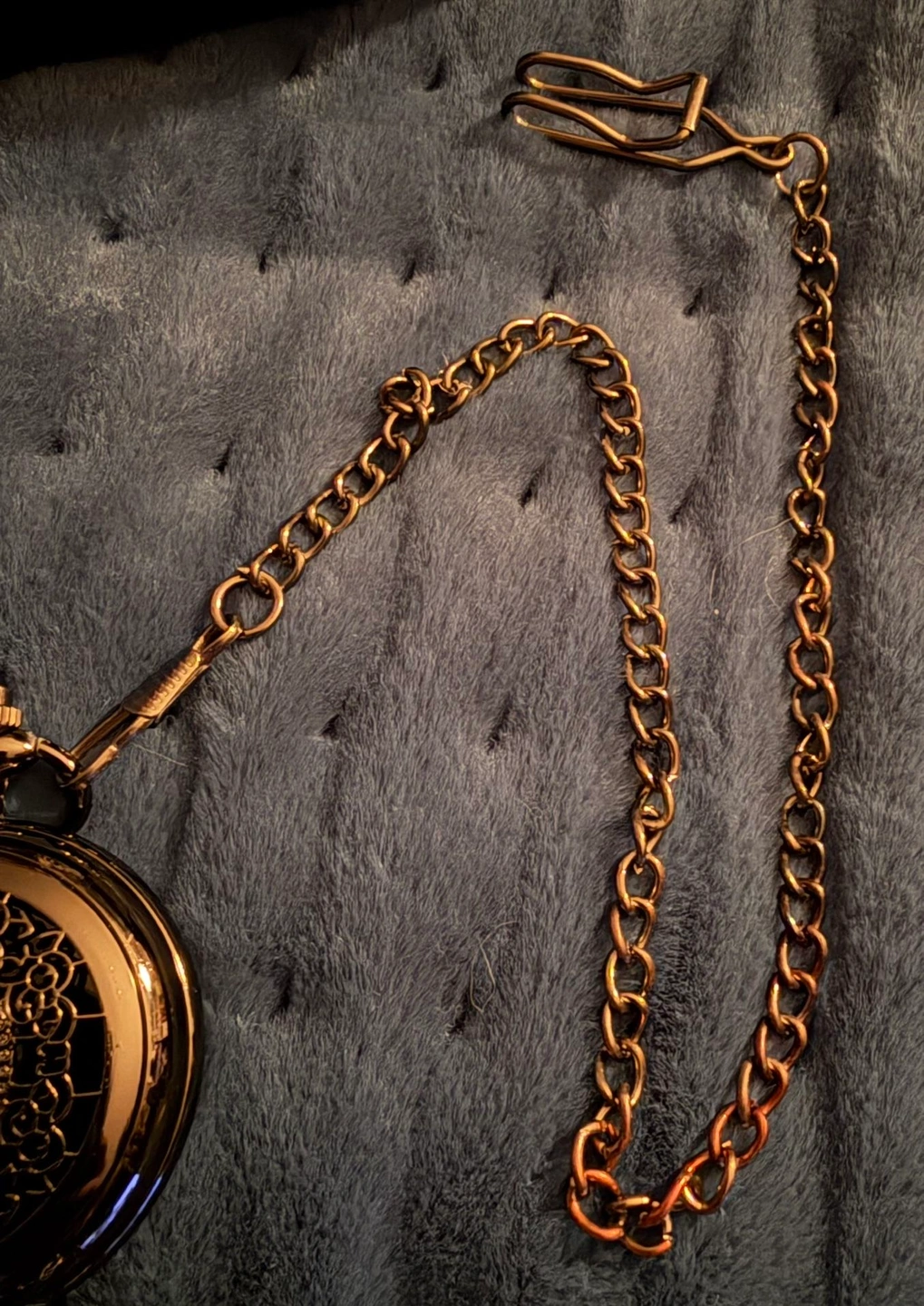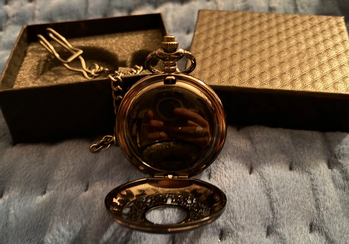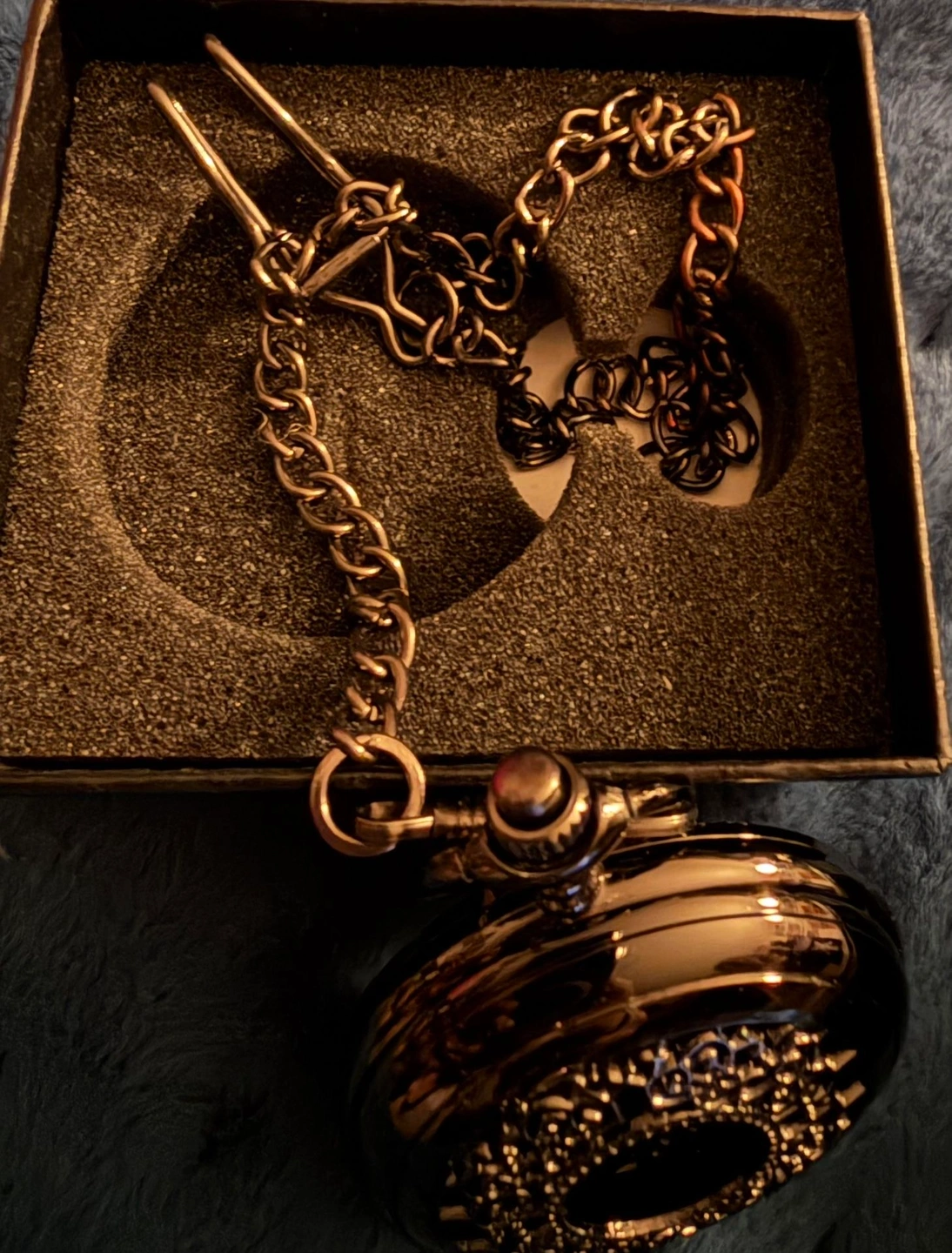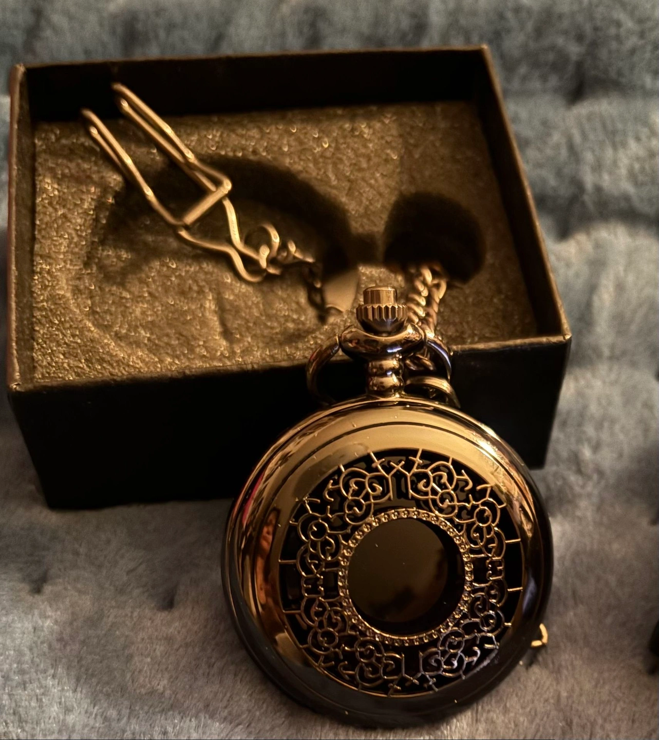 The pocket watch chain has some discoloration from sitting in drawer, it can be easily switched with another or without a chain. This is an obsidian-infused 2” diameter scrying mirror that is slightly convexed, held safely inside a vintage metal ornate etched pocket watch case. The case is portable and protects the hand-polished black obsidian stone which is set inside this hinged metal casing. Like a pocket watch, it opens from a push-button located at the middle top.