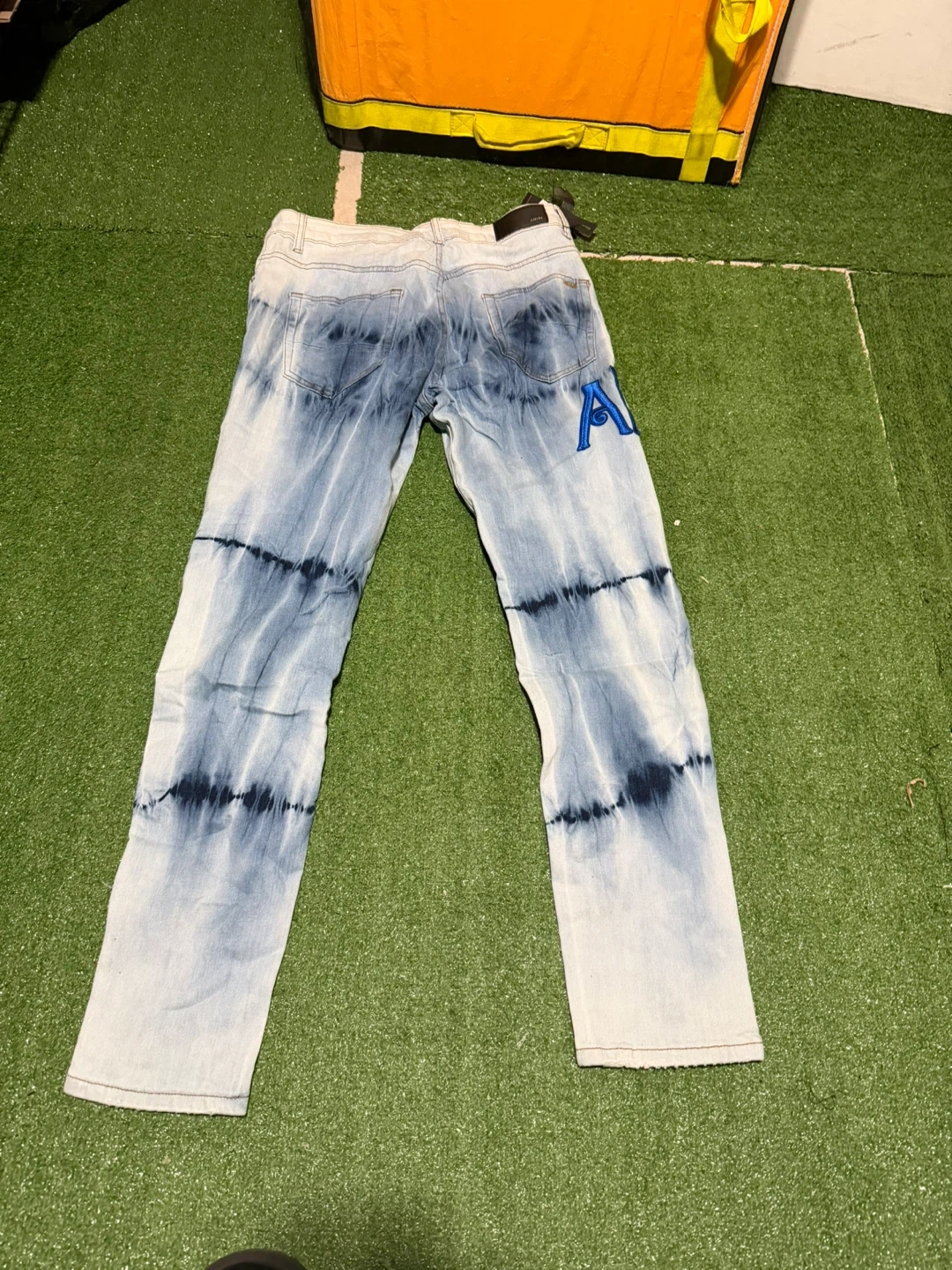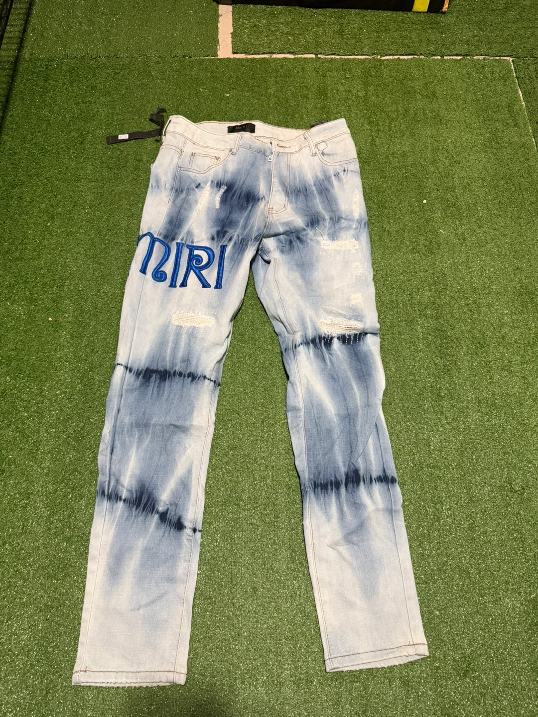 These AMIRI jeans feature a striking tie-dye pattern and distressed detailing. They come with the iconic "AMIRI" logo embroidered on the front and an "A" on the back. Denim construction.