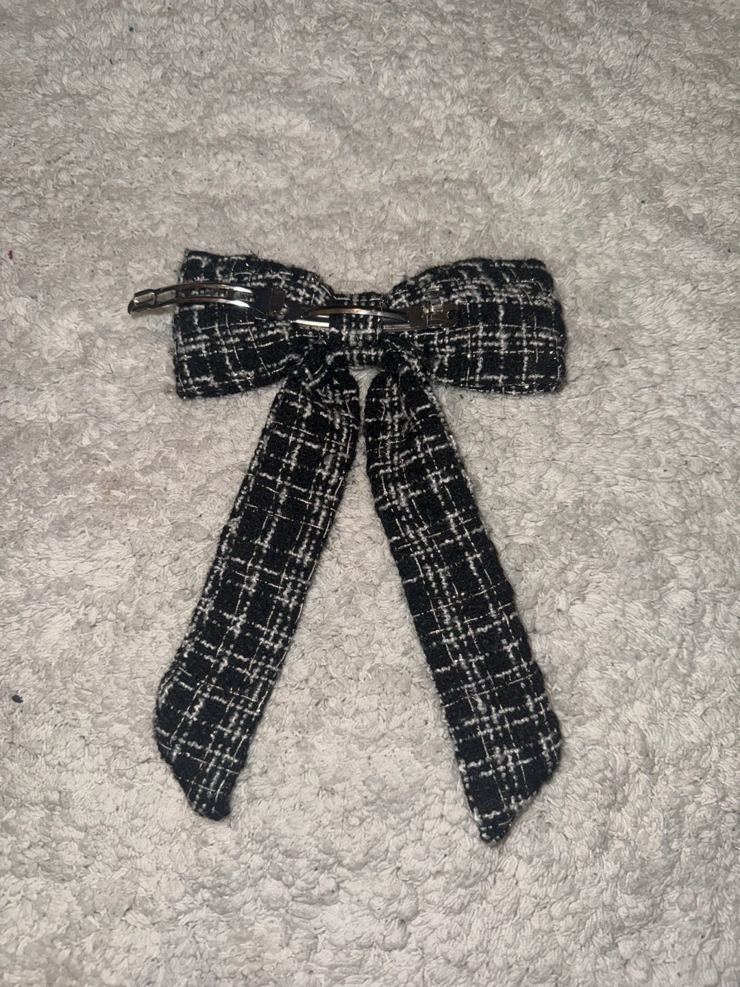 This cute bow hair clip features a classic black and white plaid tweed pattern. It's attached with a sturdy metal clip. This accessory adds a stylish touch to any hairstyle!