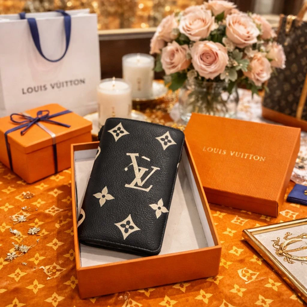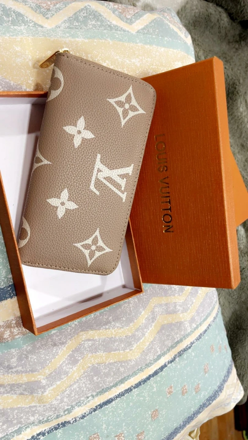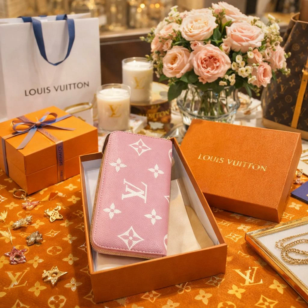 A Louis Vuitton monogram canvas zip-around wallet. This wallet features the iconic LV pattern. It comes in a classic Louis Vuitton box.