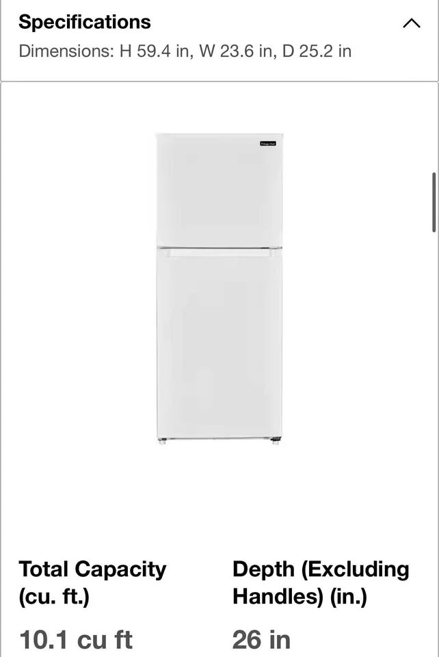Recently purchased, but we need something bigger. This space-saving 10.1 cu. ft. Magic Chef Top Freezer Refrigerator is perfect for keeping your items cold in a compact space. It's larger than a mini fridge but smaller than a traditional one, making it ideal for a breakroom, small kitchen, or office. It features a crisper with two adjustable shelves and a freezer with a slide-out wire shelf. The adjustable electronic temperature control system offers different settings for great control over the interior temperature. It has two glass and one fixed refrigerator shelves for easy storage and accessibility. The clear produce crisper lets you easily identify your fruit or vegetable contents. An in-door can holder allows you to grab beverage cans with ease, and clear door bins and a bottle rack keep your condiments and larger bottles easily accessible. It offers 2.7 cu. ft. of freezer space and 7.4 cu. ft. of fridge space. The separate top freezer compartment is convenient for frozen food storage. It has automatic defrost for added convenience and gallon door storage for larger beverages. The fresh food section has an interior incandescent light. The two reversible doors allow you to place the unit according to your space requirements. It's Energy Star qualified, meaning year-round energy savings. The original warranty was one-year on parts and labor, and five-years for the compressor (part only). It retails for $770.