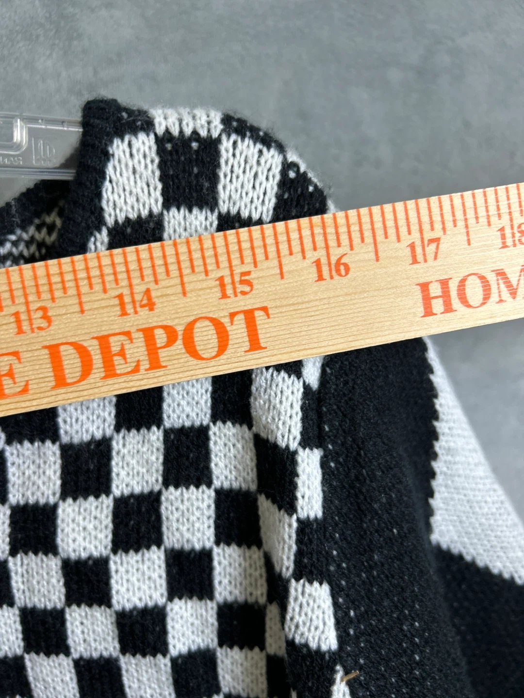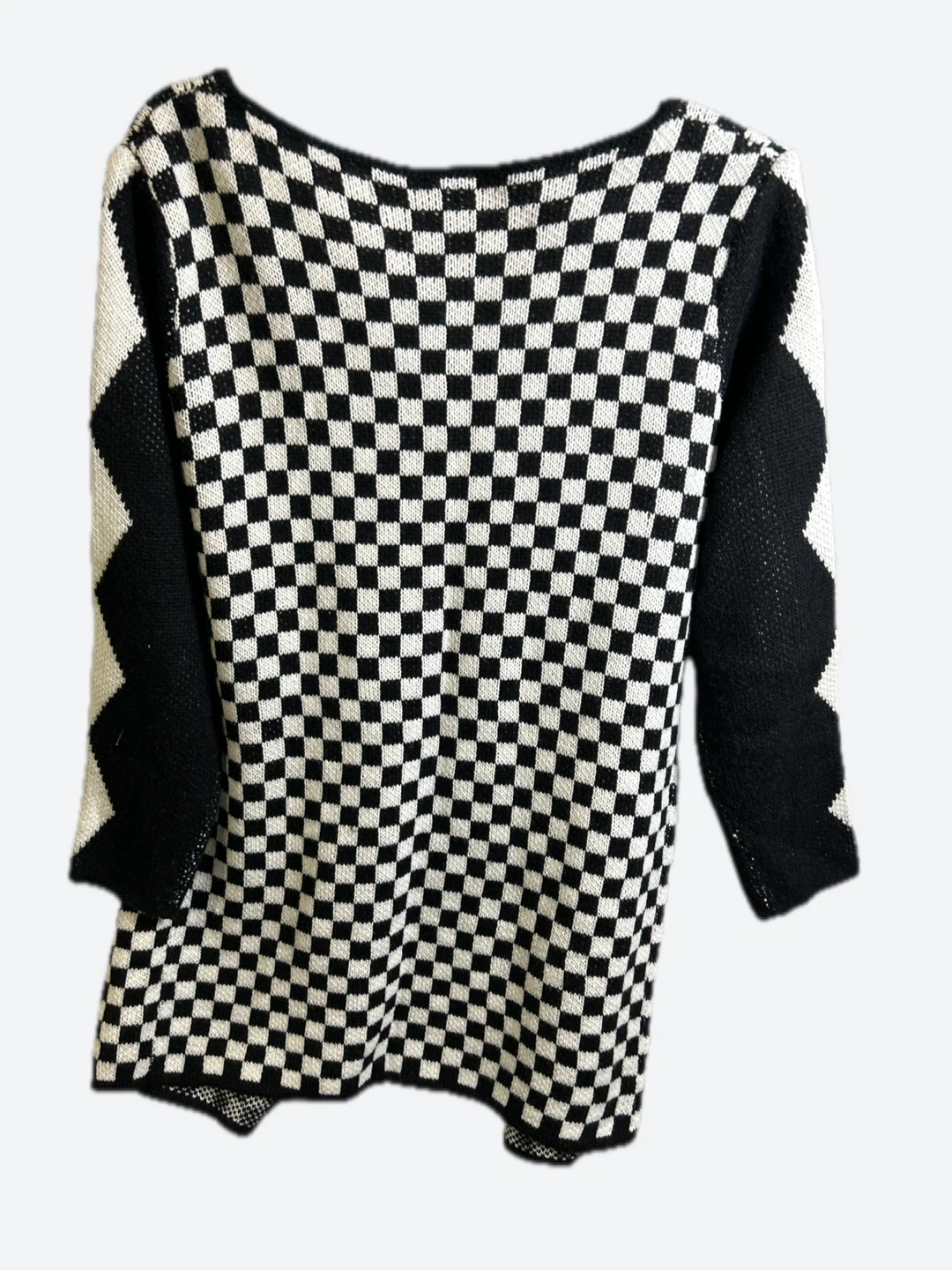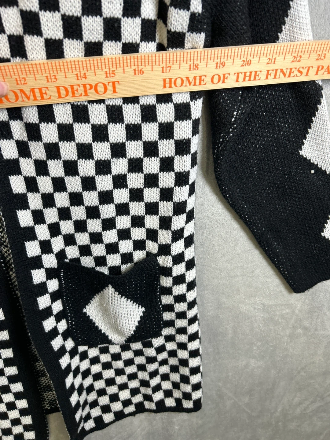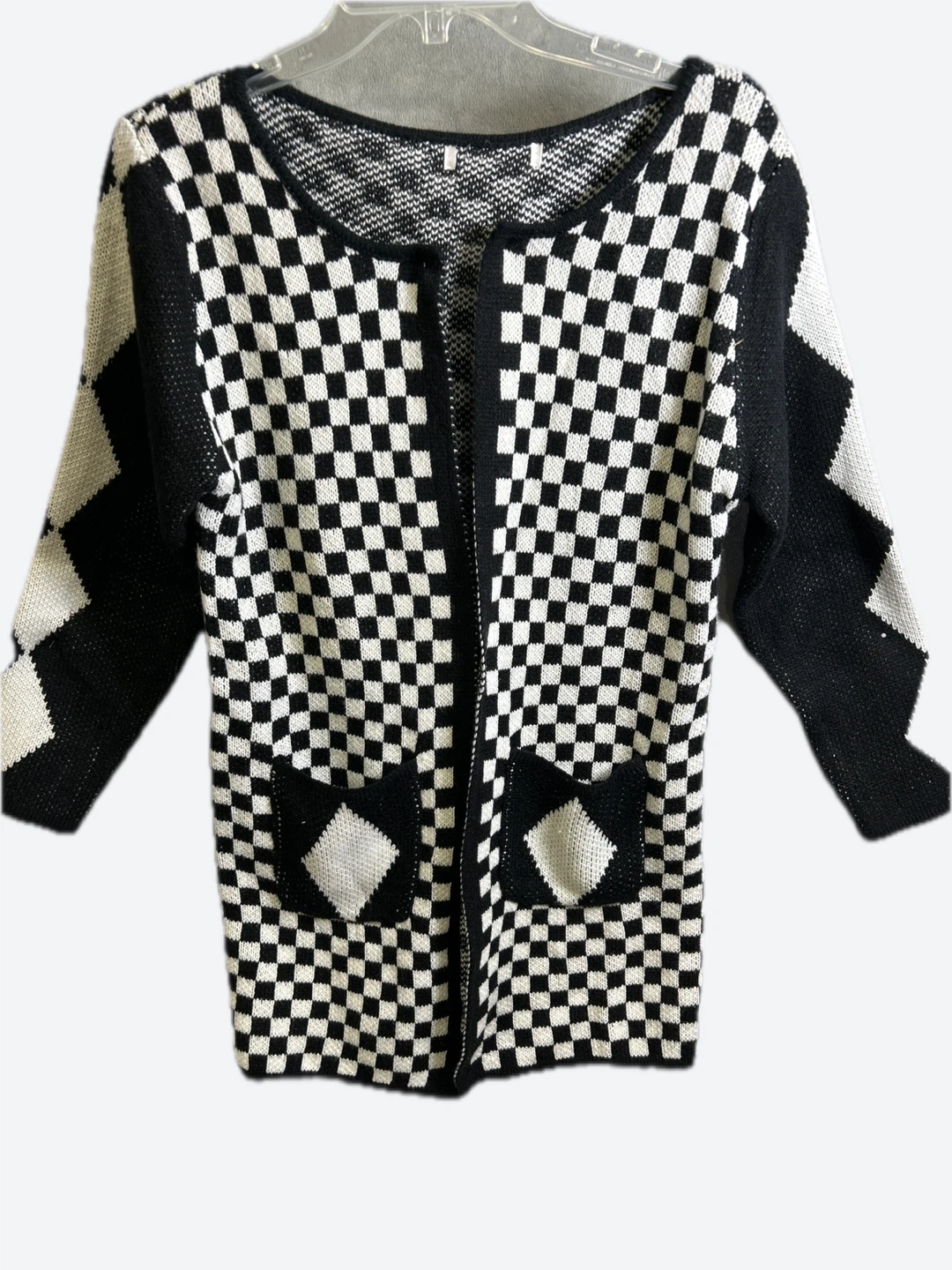 This cardigan features a bold checkerboard pattern with diamond accents on the sleeves and pockets. It's a comfortable knit piece perfect for layering. The approximate measurement from shoulder to hem is 25 inches. Size medium