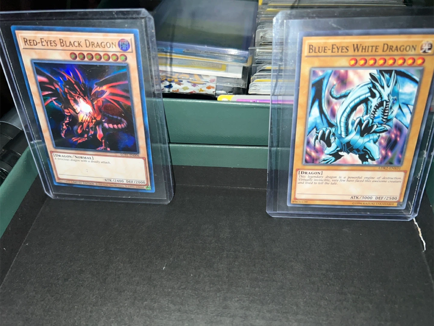 Yu-Gi-Oh! trading cards featuring Red-Eyes Black Dragon and Blue-Eyes White Dragon. Red-Eyes Black Dragon has ATK/2400 DEF/2000. Blue-Eyes White Dragon has ATK/3000 DEF/2500. These are iconic monster cards from the game.
