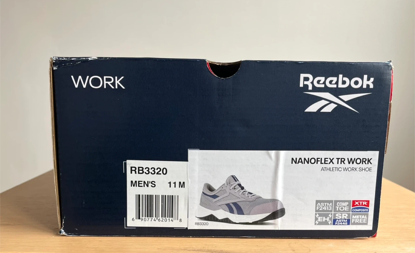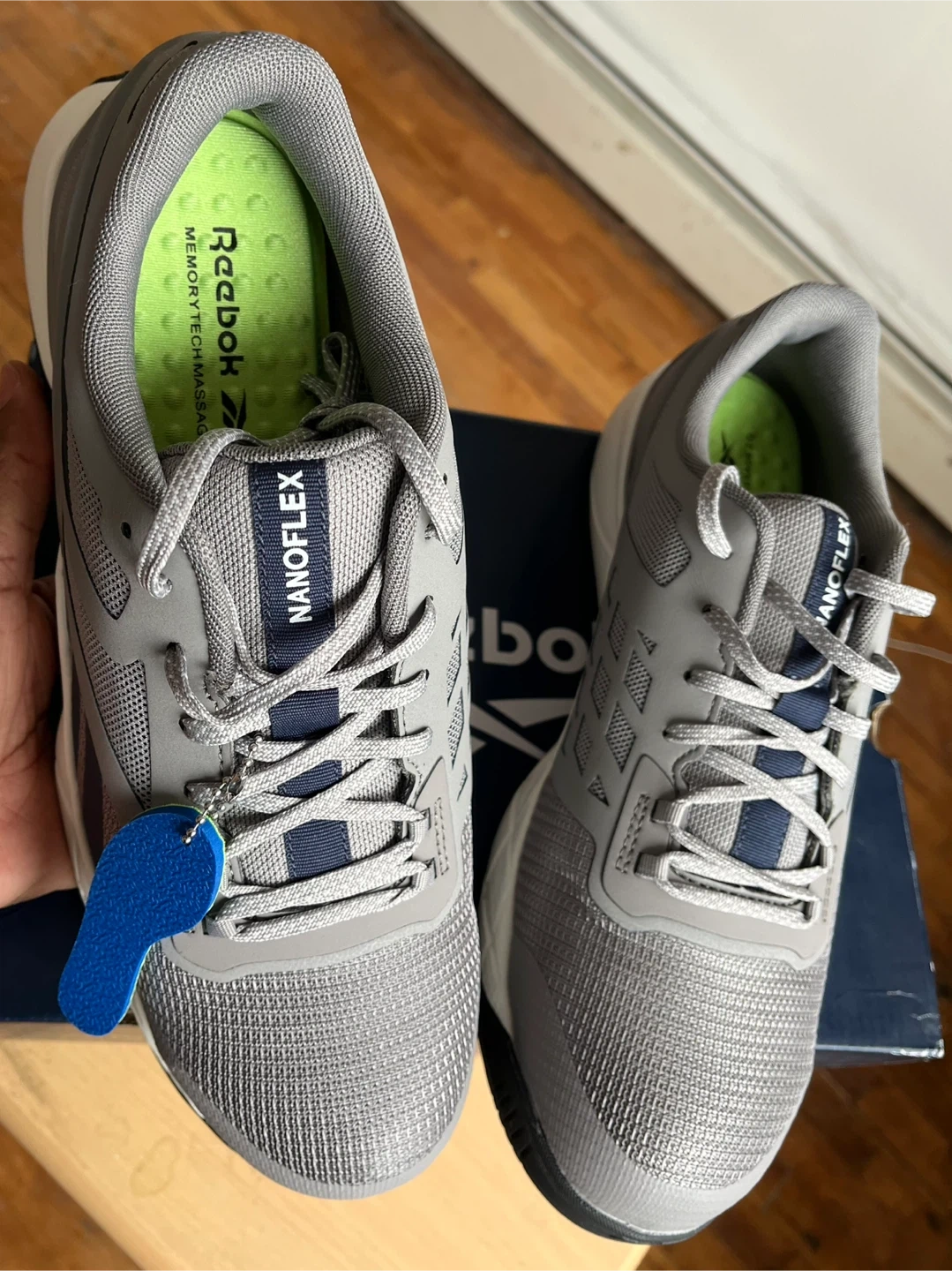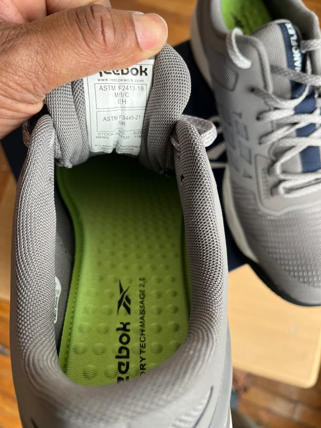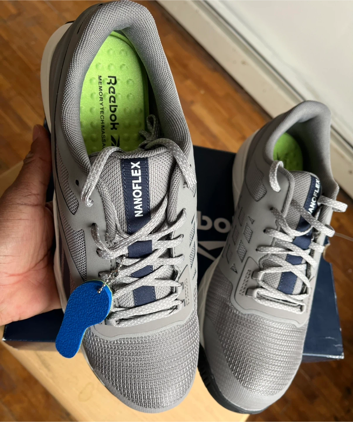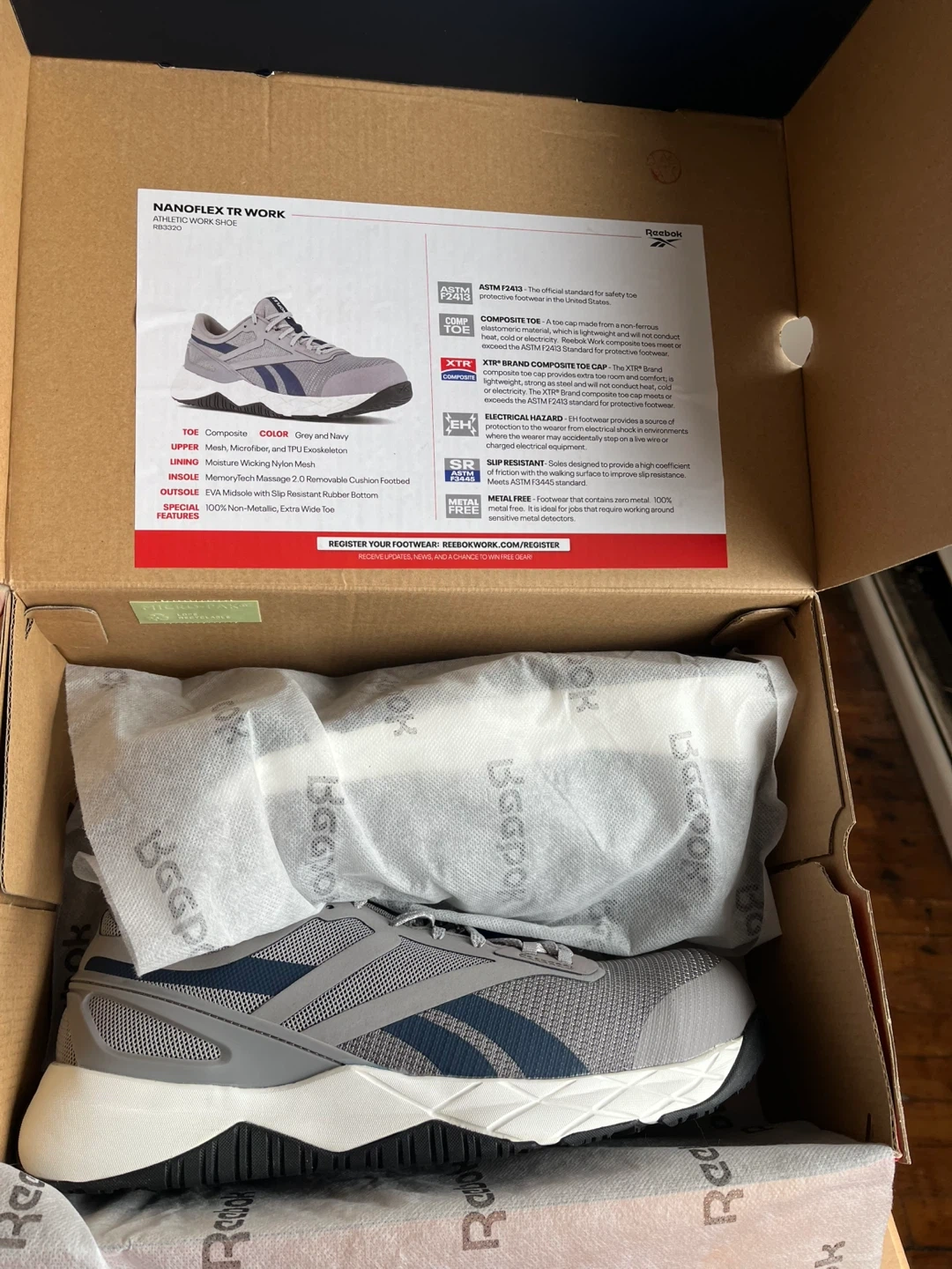 Reebok Nanoflex TR Work athletic shoes for men. These are grey and navy with a composite toe. They feature a moisture-wicking nylon mesh lining and a slip-resistant rubber outsole. Includes original box!