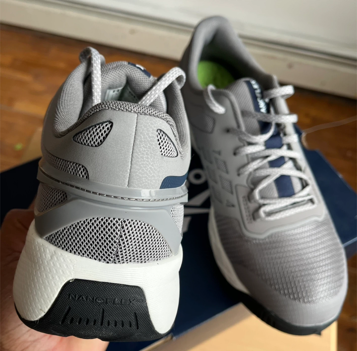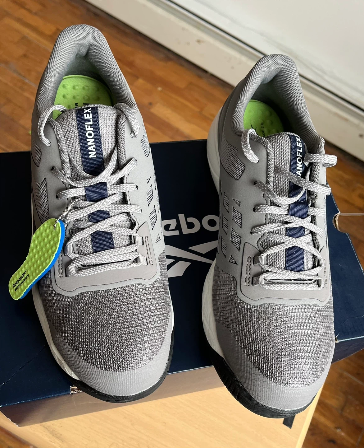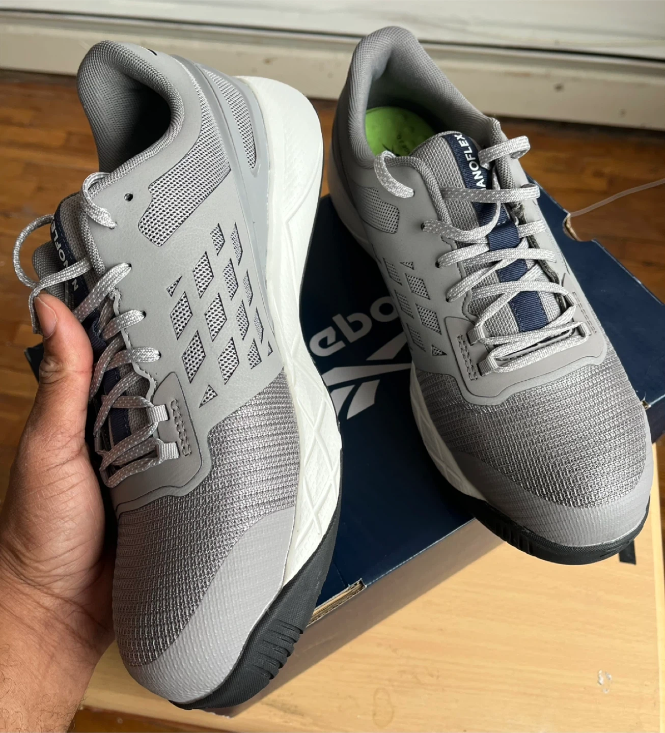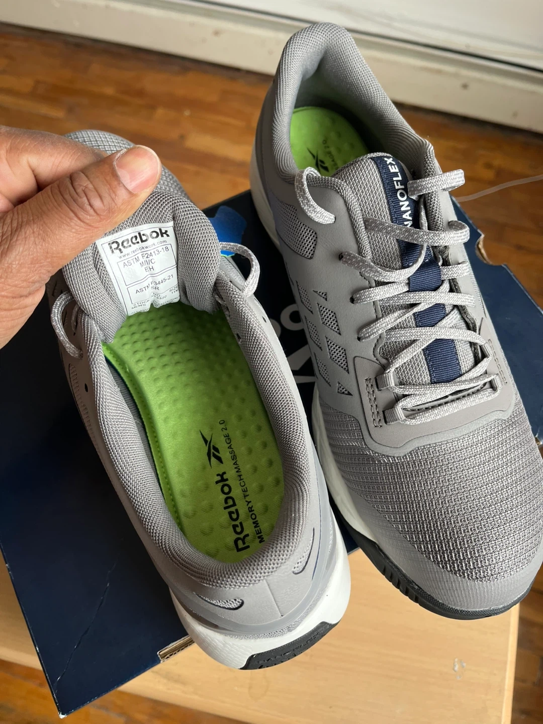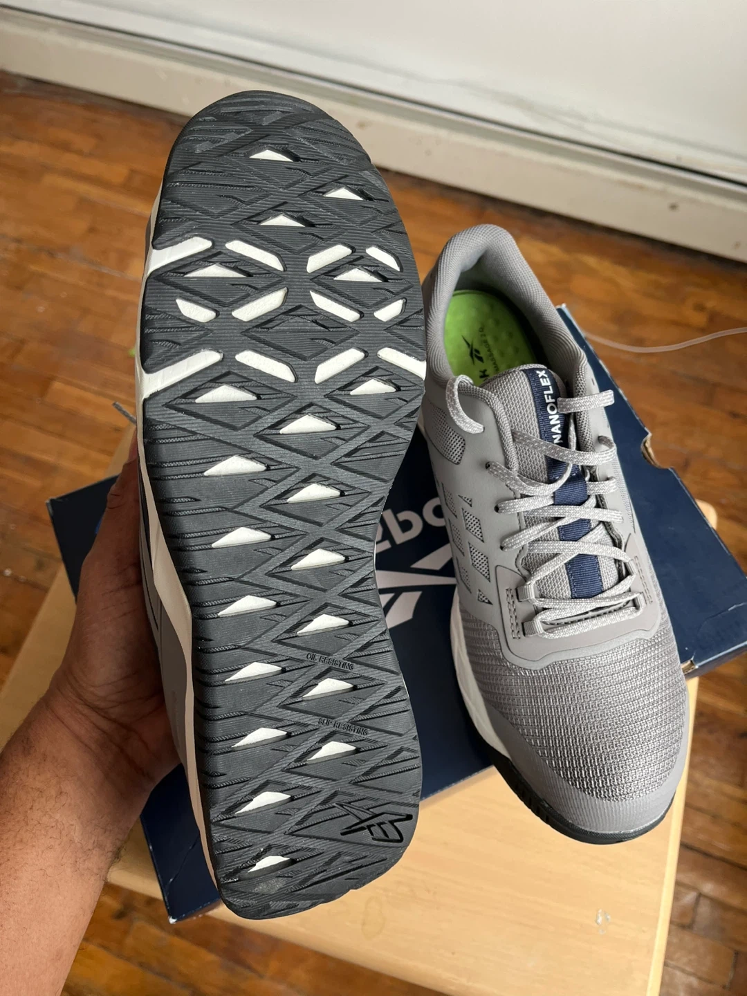 Reebok Nanoflex TR Work athletic shoes for men. These are grey and navy with a composite toe. They feature a moisture-wicking nylon mesh lining and a slip-resistant rubber outsole. Includes original box!